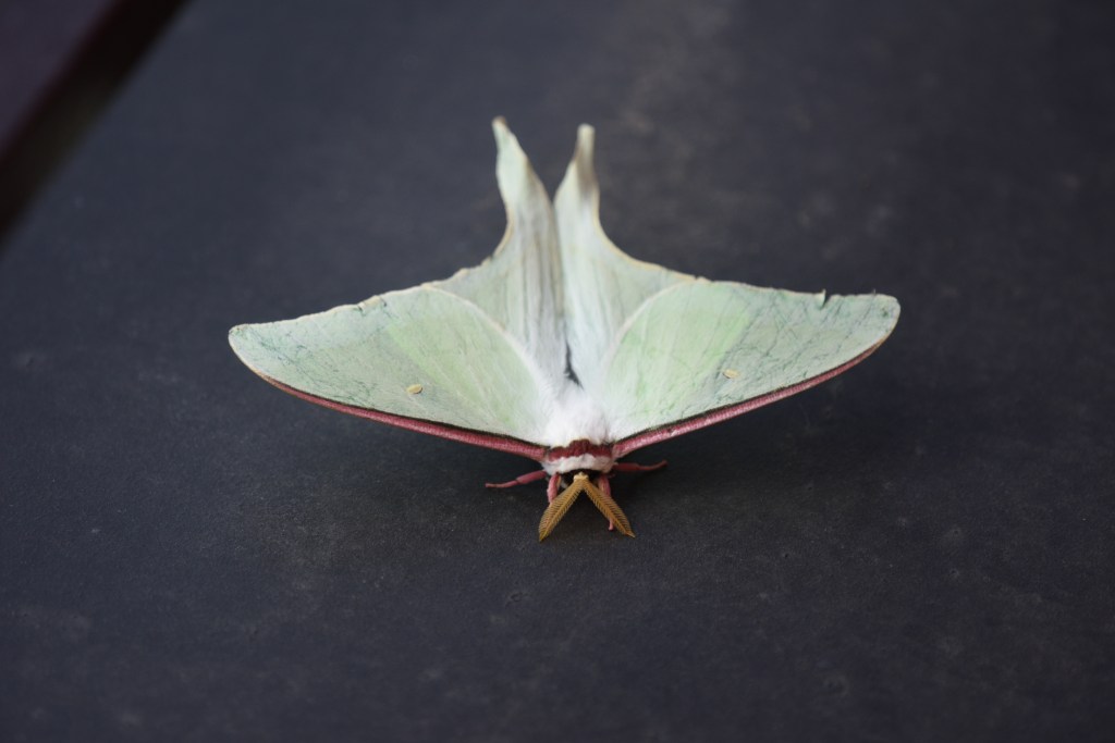 図鑑で調べてみるとヤママユガ科の1種でオオミズアオという。ヤママユガ科は最も大型で成虫は口がなく何も食べない。オオミズアオの大きさは78~94mm。