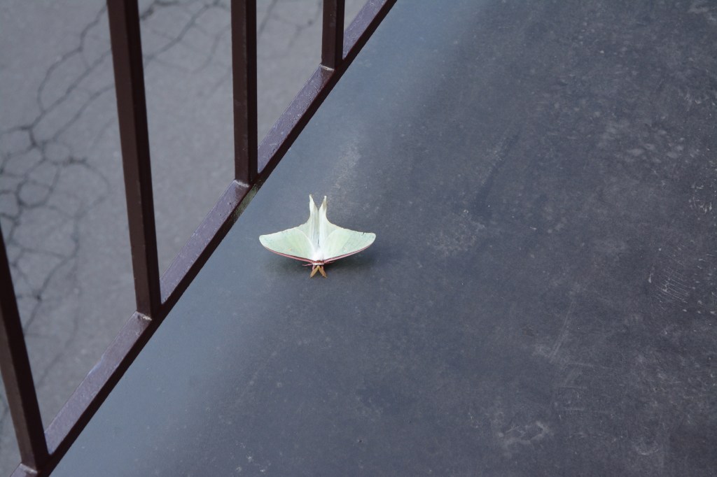 朝刊を取ろうと玄関を開けると、2階通路にかなり大きな白い蛾がとまっていた。