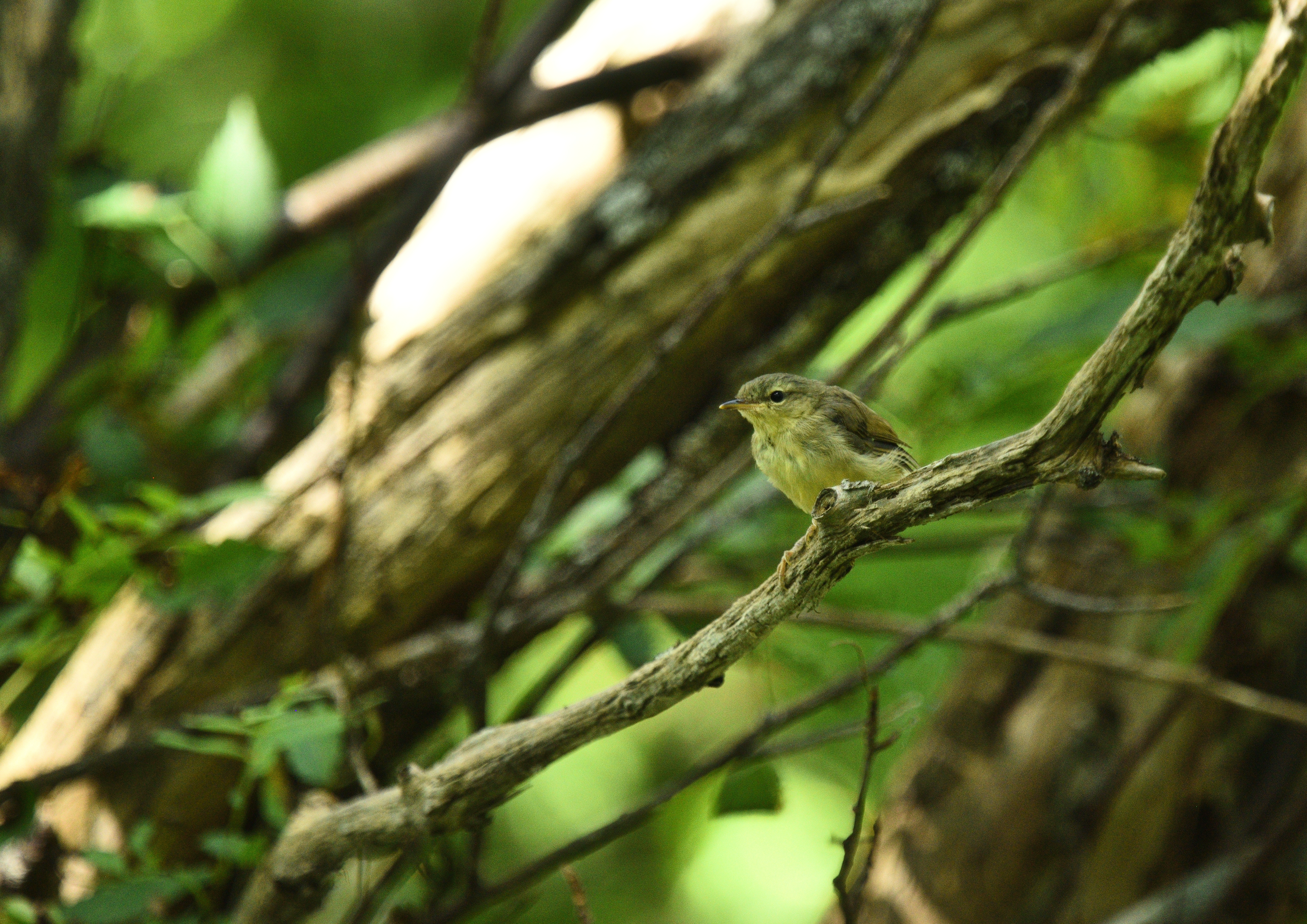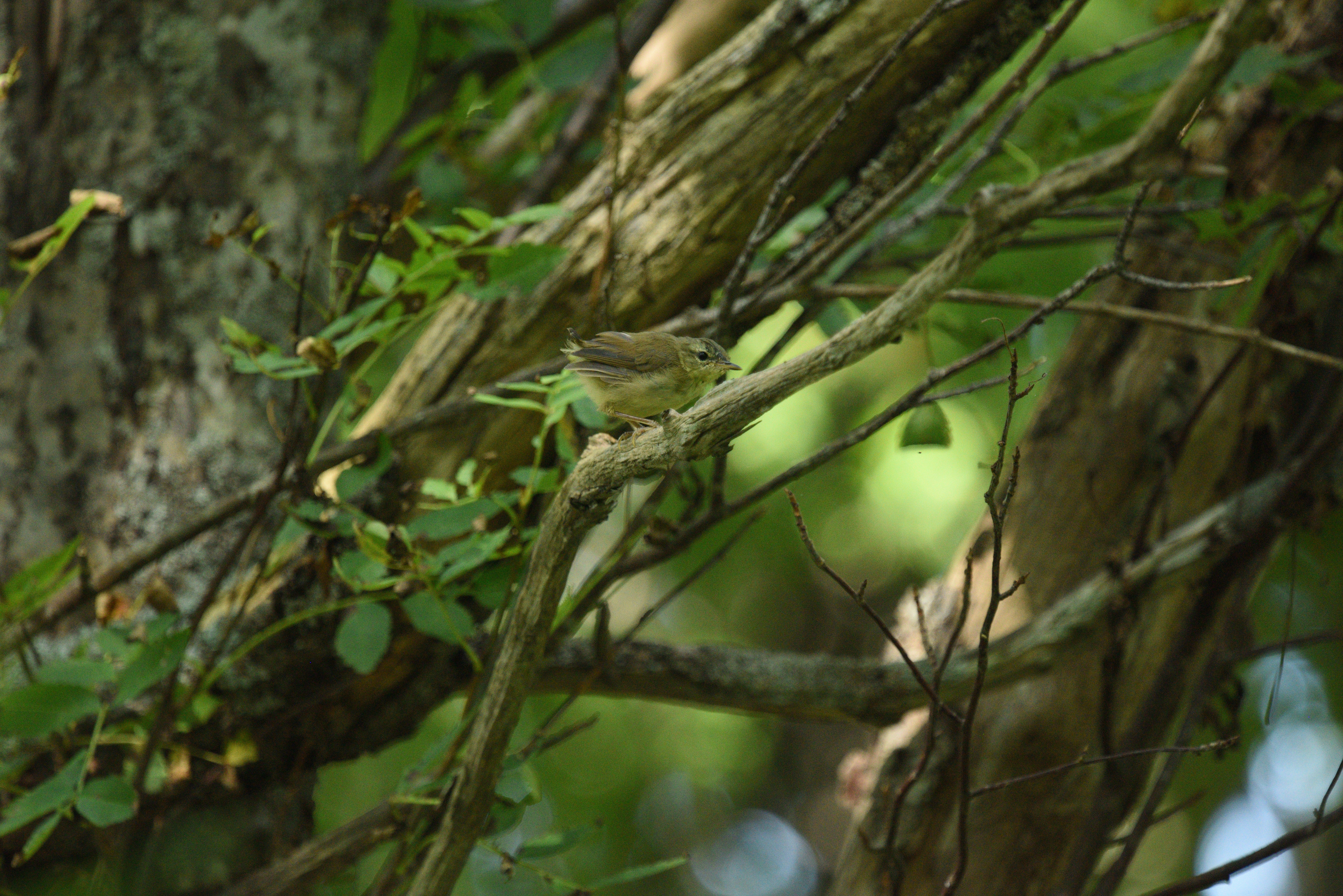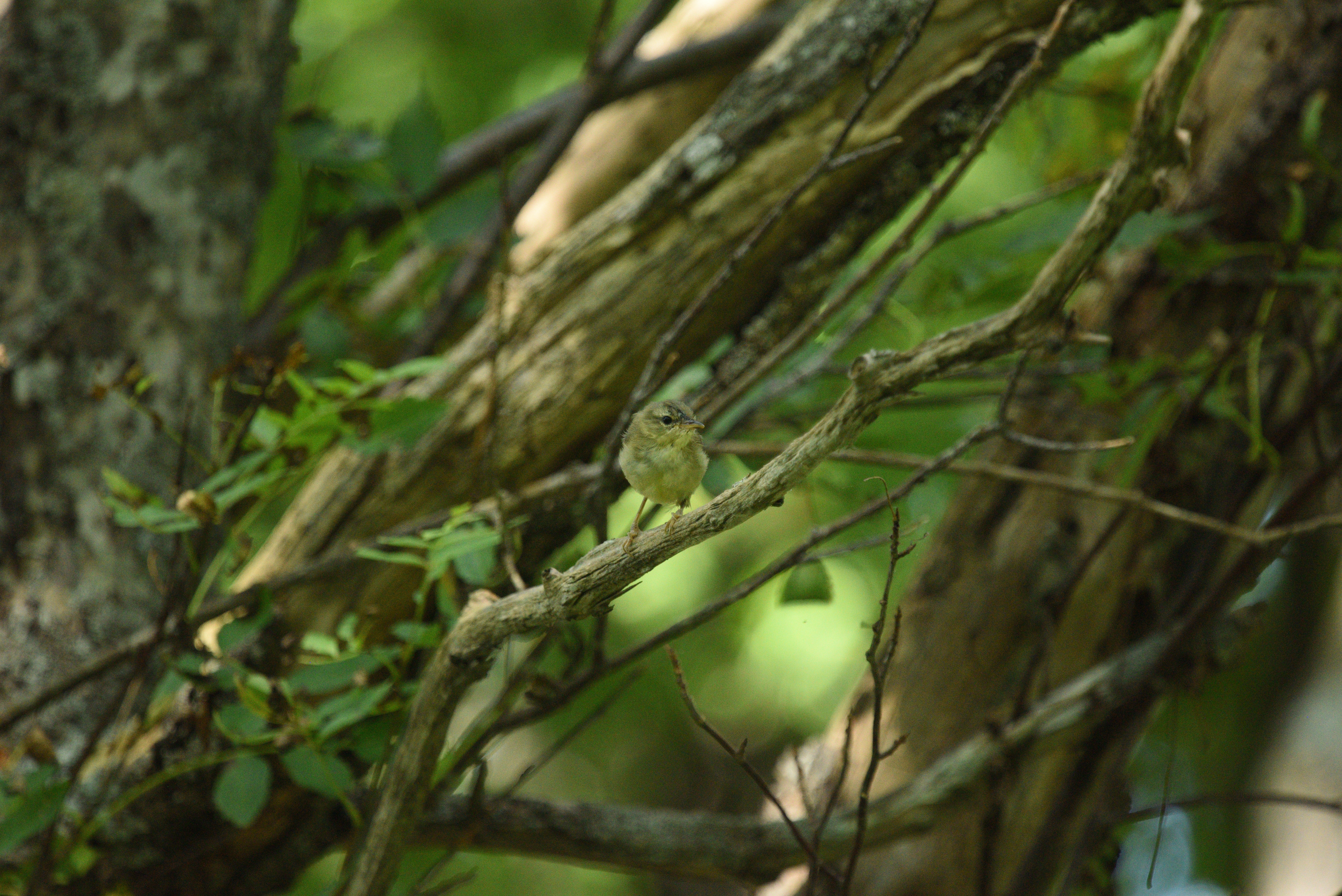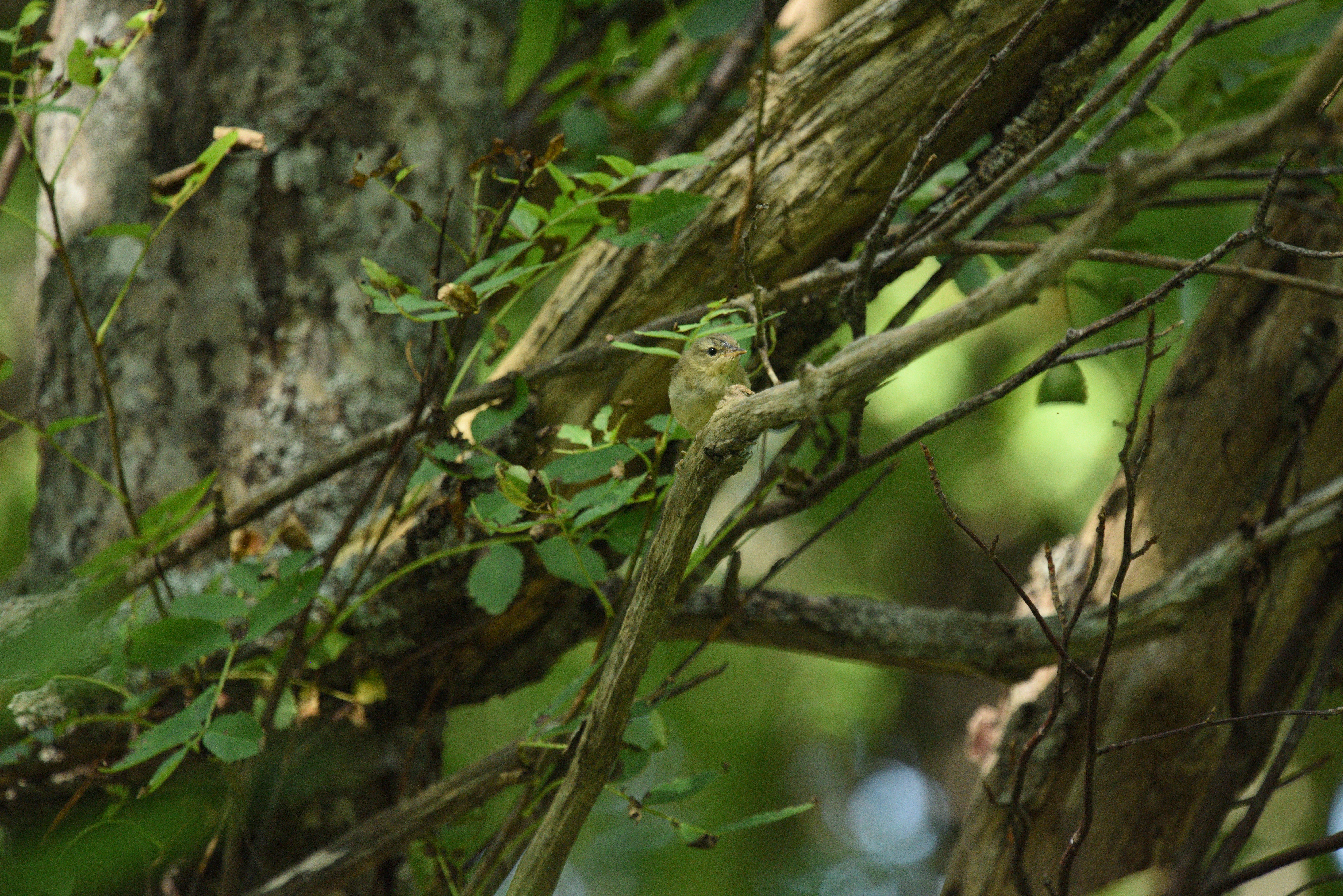 一旦リーフに戻り、原野の探索の装備を整えて、キャンプ場から延びている道を歩き始めた。背丈の低いクマイザサからウグイスの地鳴きが聞こえる。しばらく待っていると、幼鳥が姿を現した。まだ羽毛の色が淡くてモフモフで、どことなくあどけない。