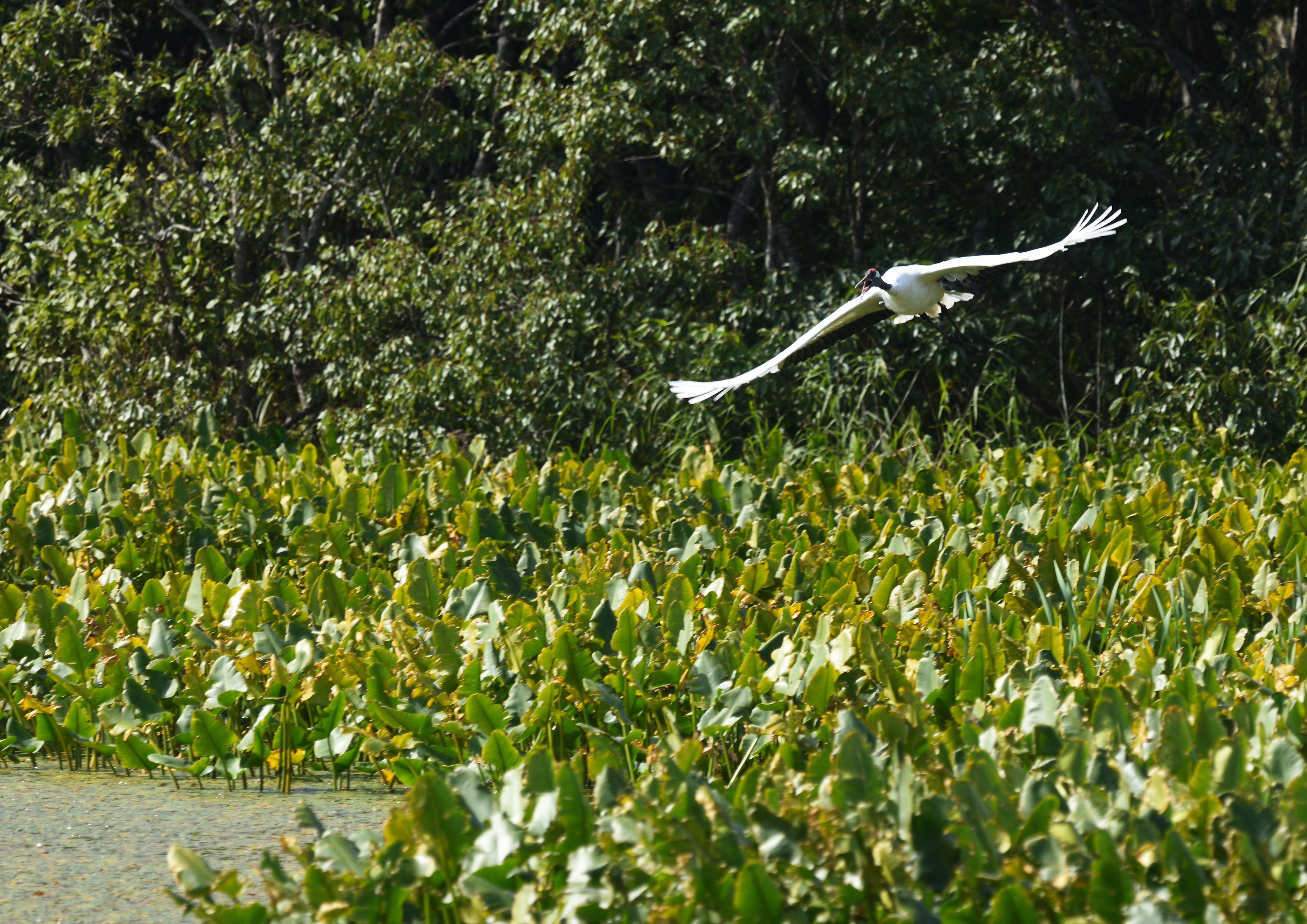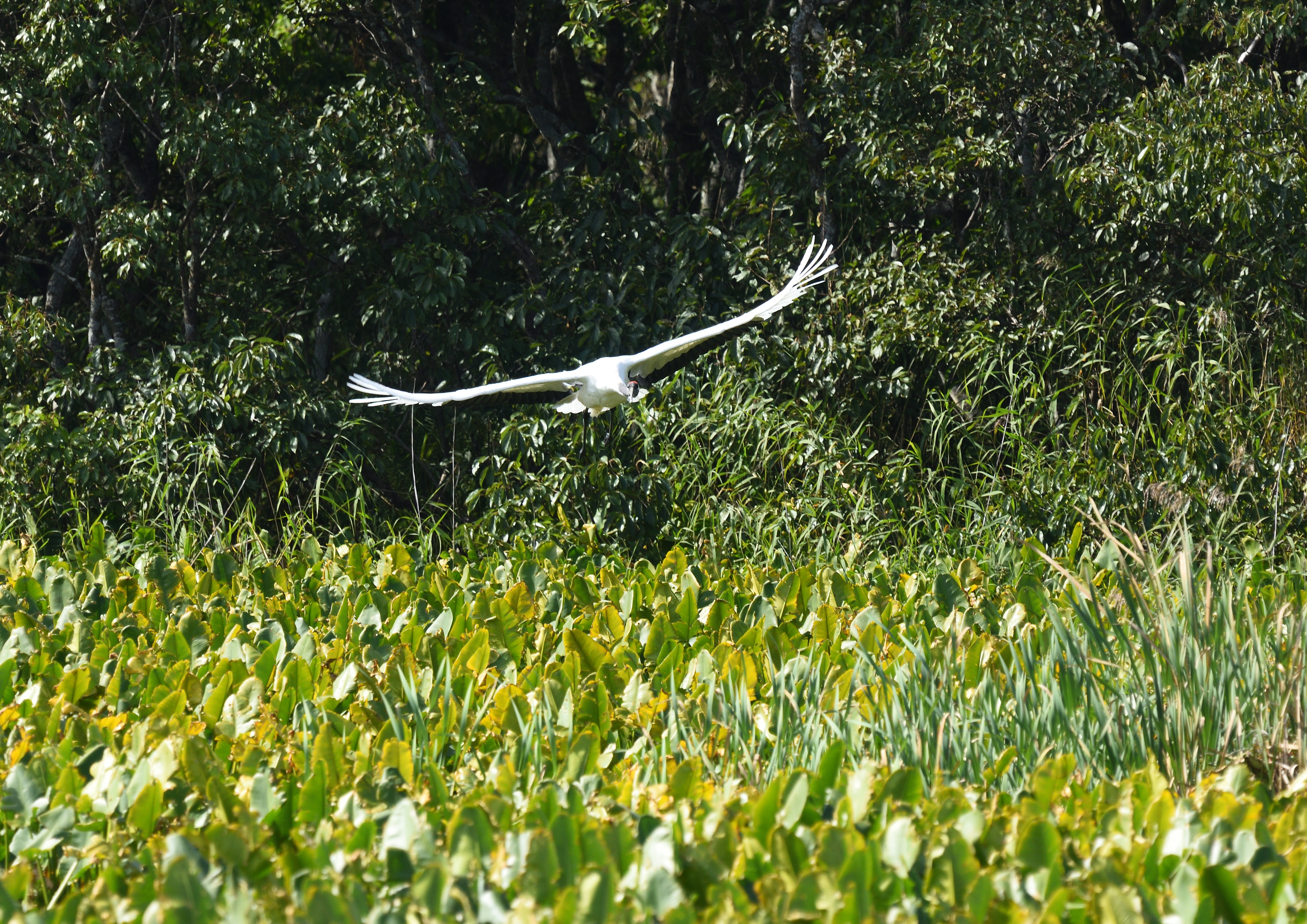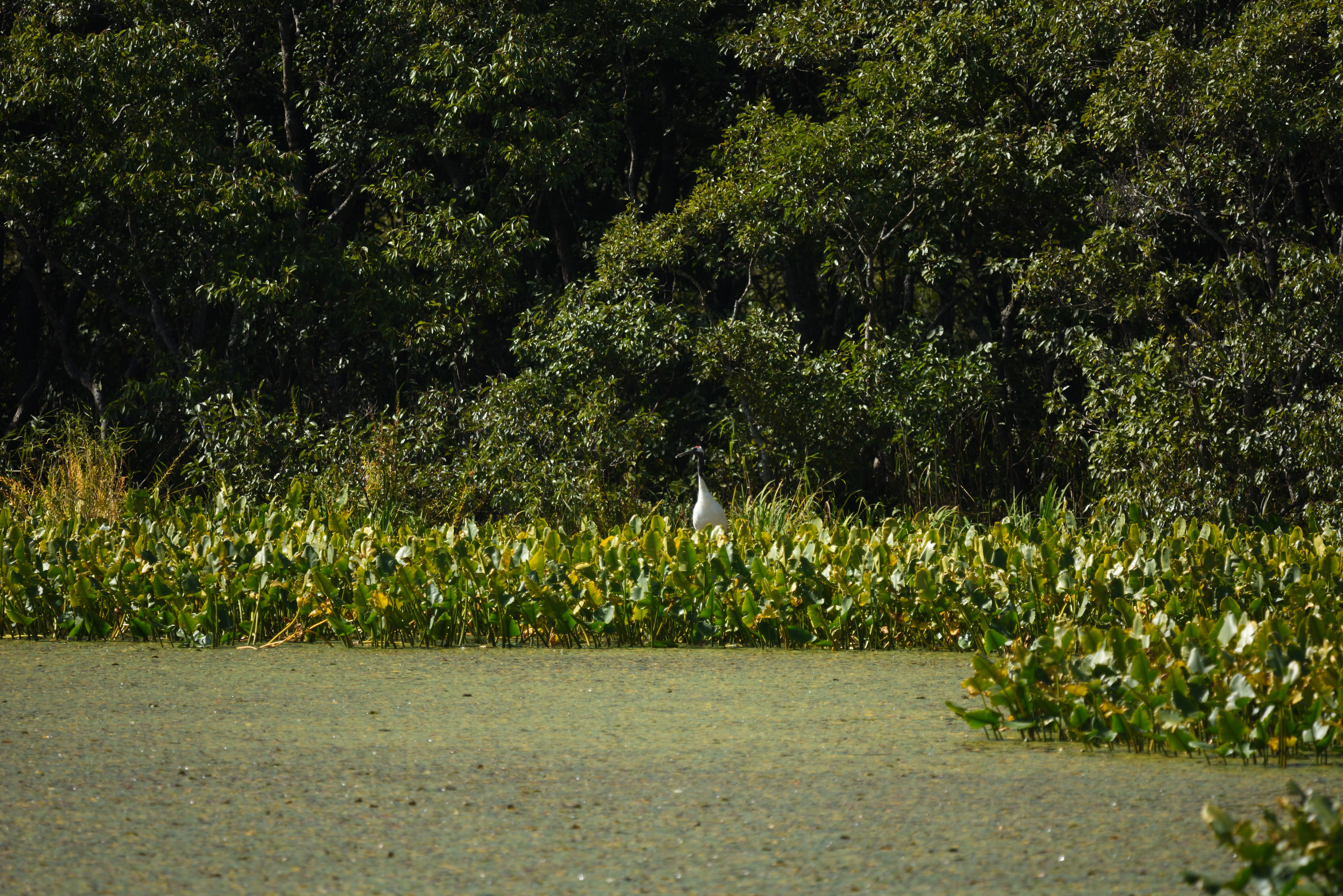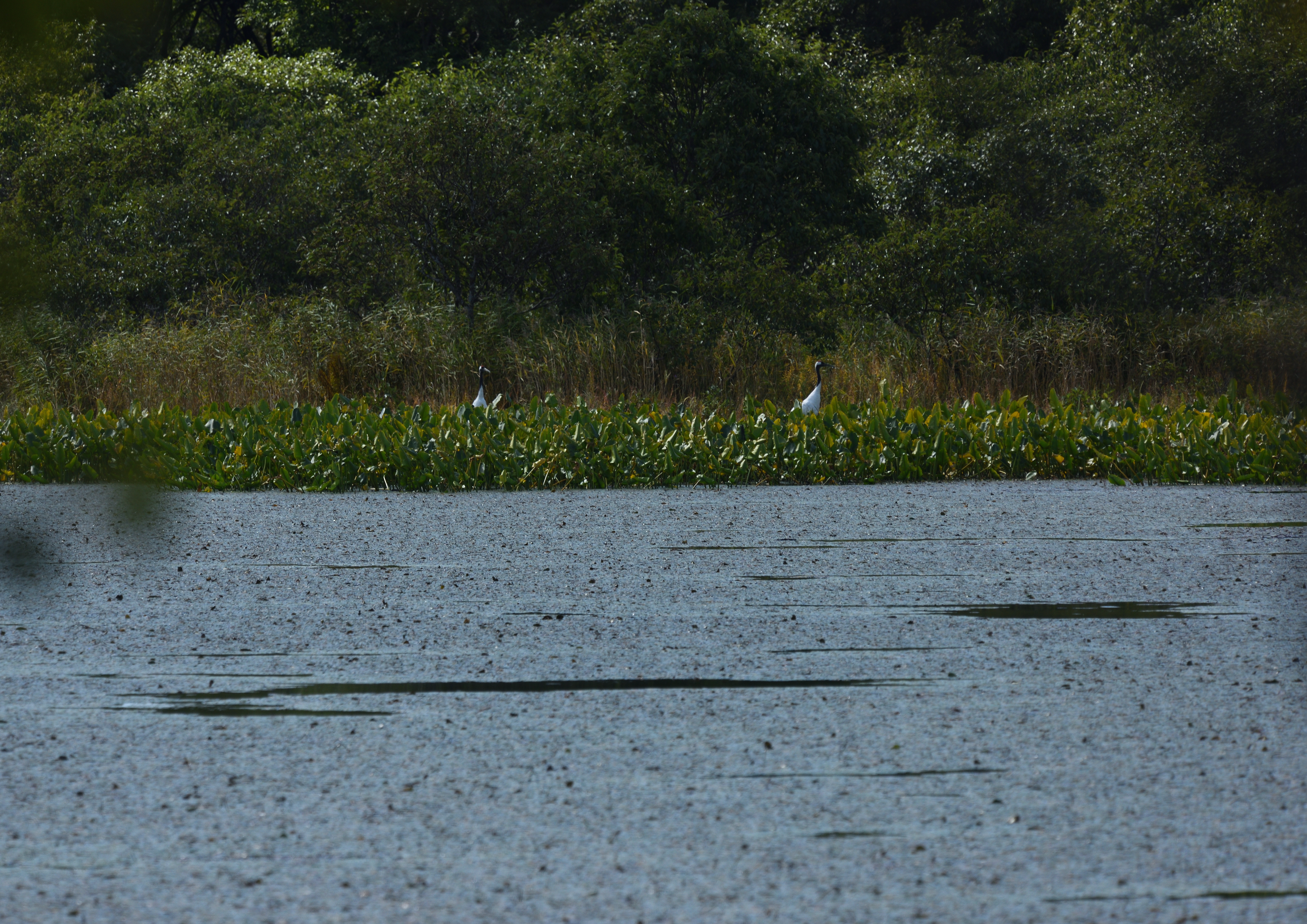 広大な芦原の広がる道を進んでいくと、小さな細長い沼に出た。放置されて朽ち始めている木造の展望デッキから辺りを見回すと、遠くの対岸に何やら白い物が・・・。もしやタンチョウかと思い、ファインダーを覗くと、飛び立ってしまった。二羽だったが、さらに遠くの畔に止まった。この日は街で着るティンバーランドの白いチェック柄のシャツを着ていたが、タンチョウが目立つように白い服も目立つので、フィールドでは避けるべきだった。