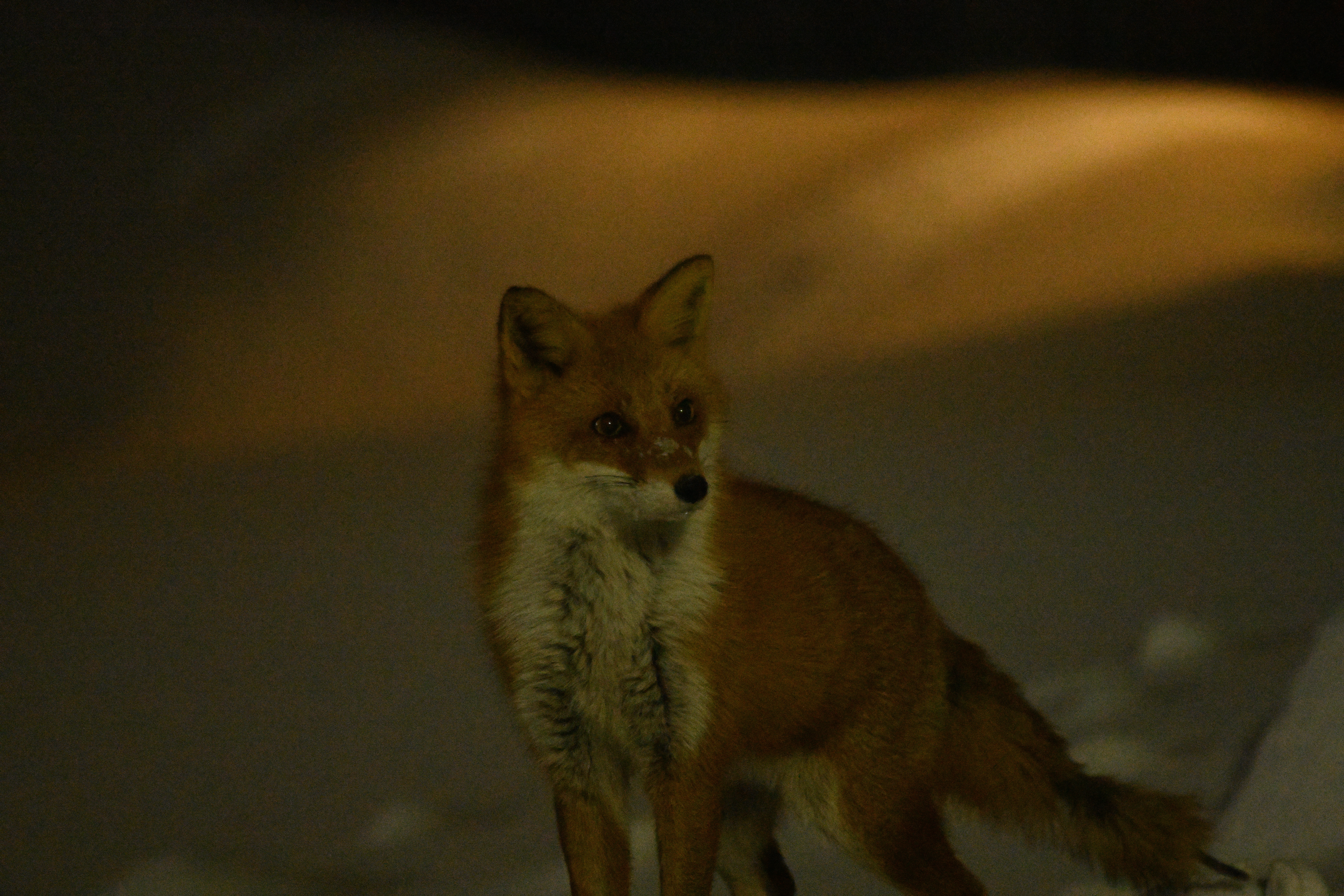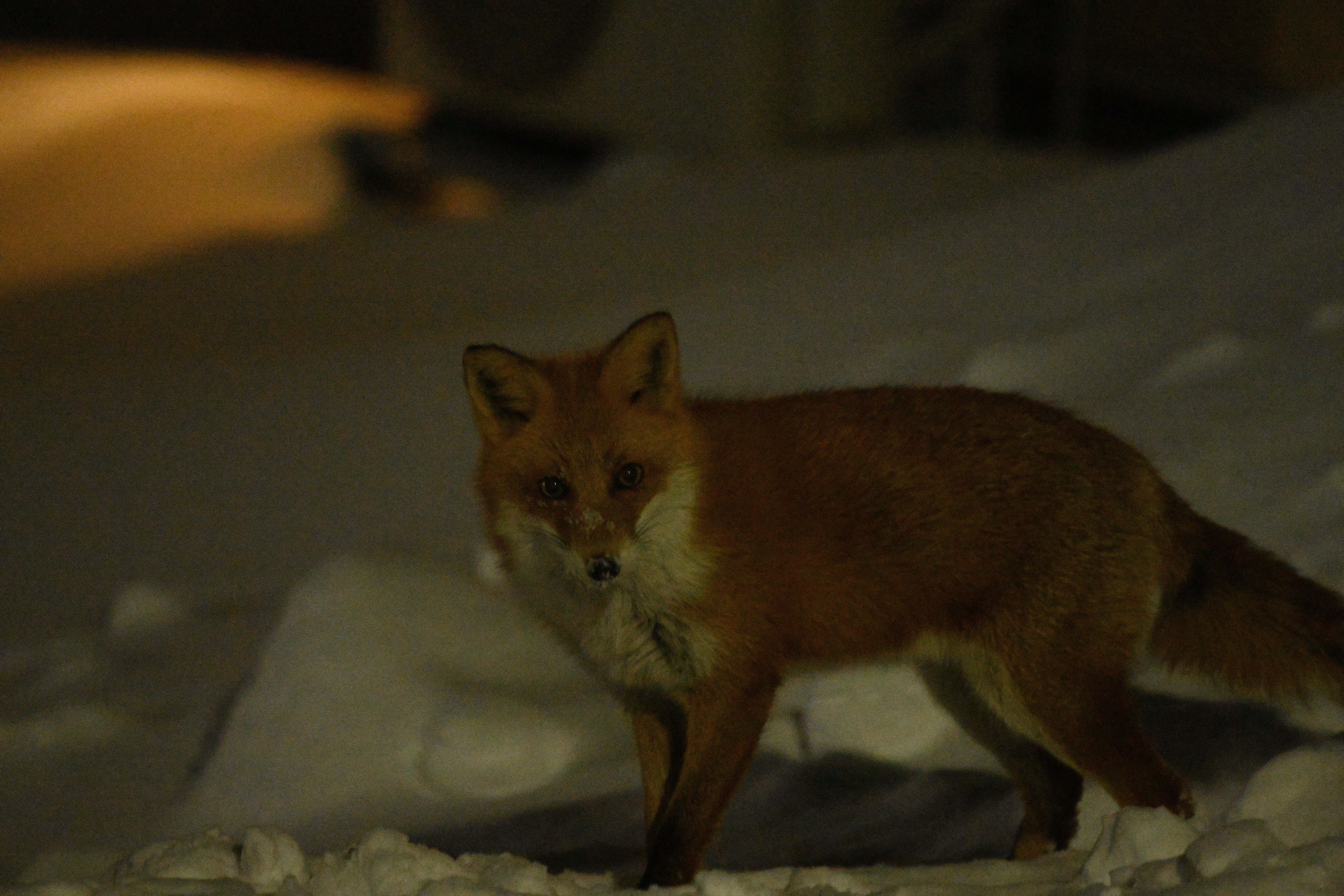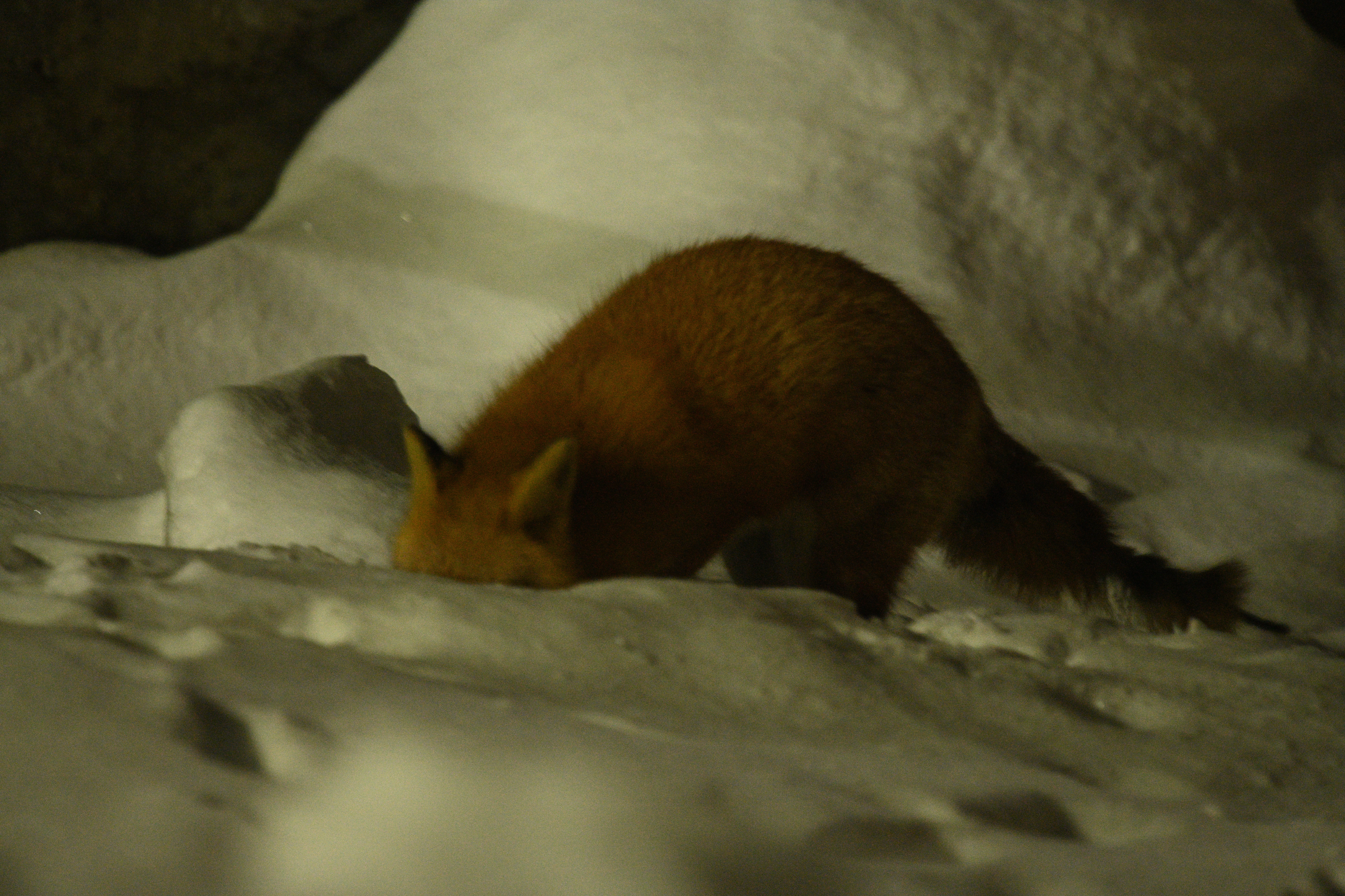 道路わきの空き地の雪に鼻を突っ込んで何かを探しているようだ。だがどういうわけかZ7が全くフォーカスしてくれない。一度路上に出て街頭に照らされ、撮影のチャンスだったがこれも逃し、再び空き地に戻ったところを何コマか撮影できた。Z7はD810より常用ISO感度が高いので、夜間での撮影でもノイズが抑えられているはずだ。