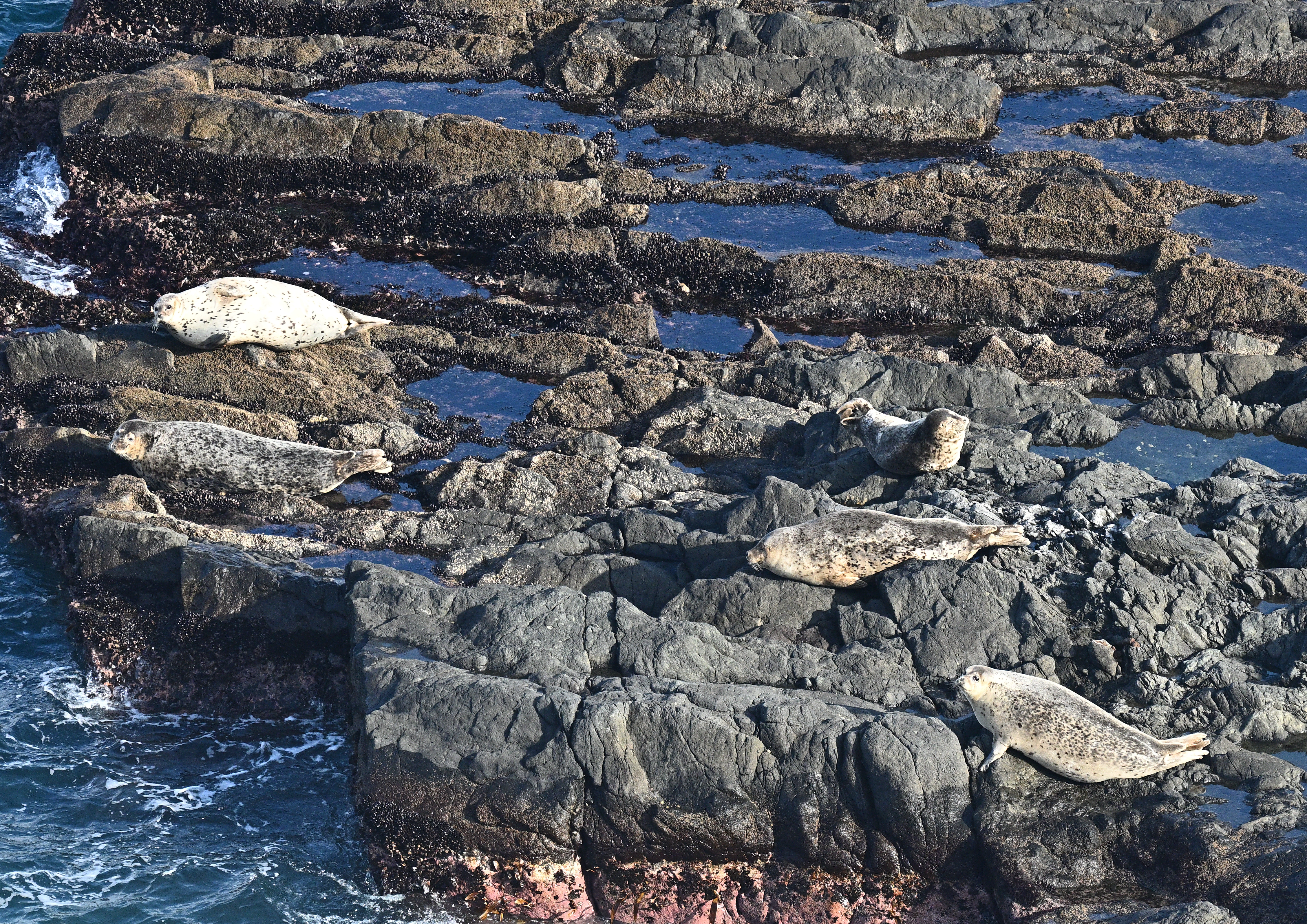 右側の岩礁を見下ろすとアザラシが日向ぼっこしている。4頭だと思っていたが写真で見ると5頭いた。