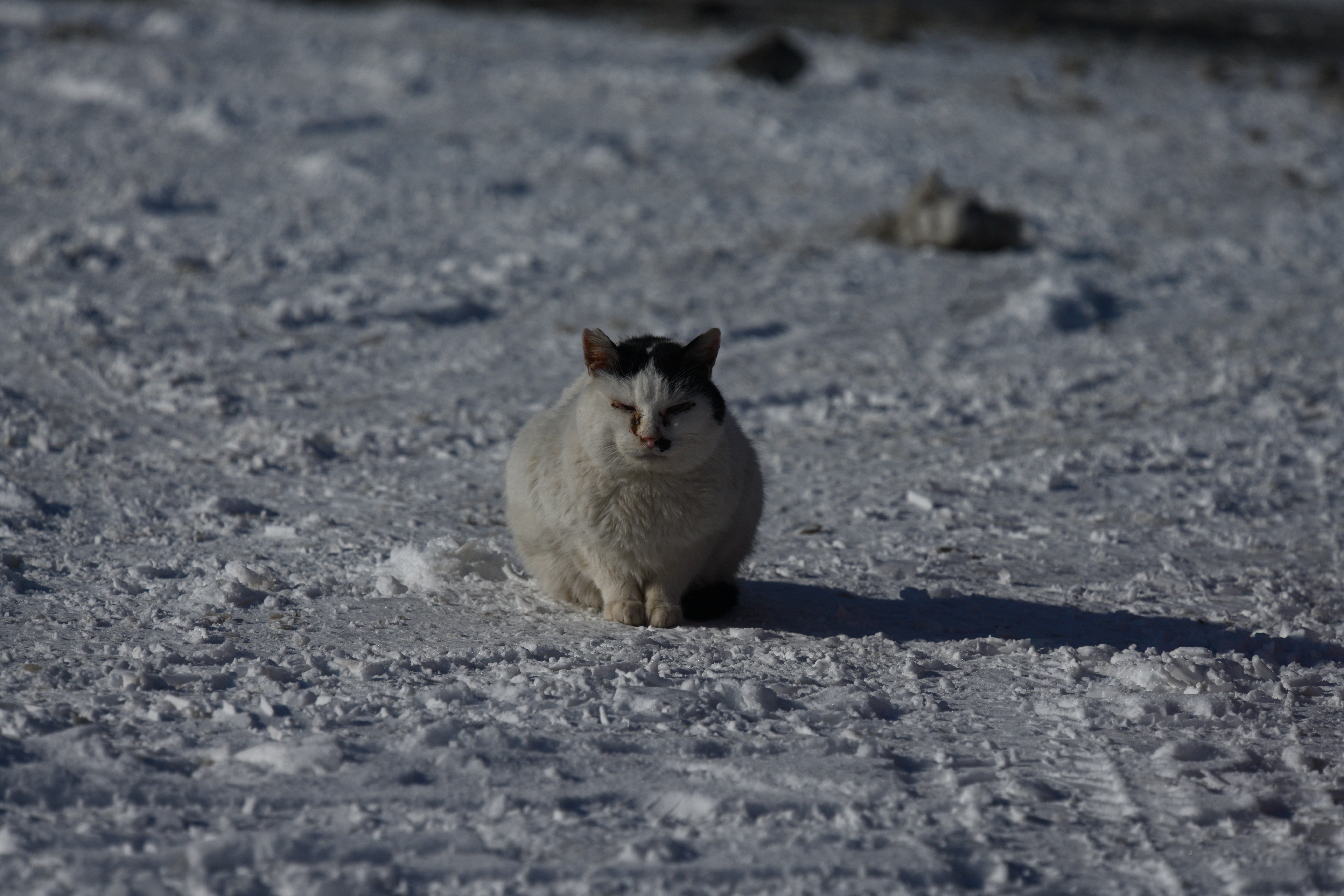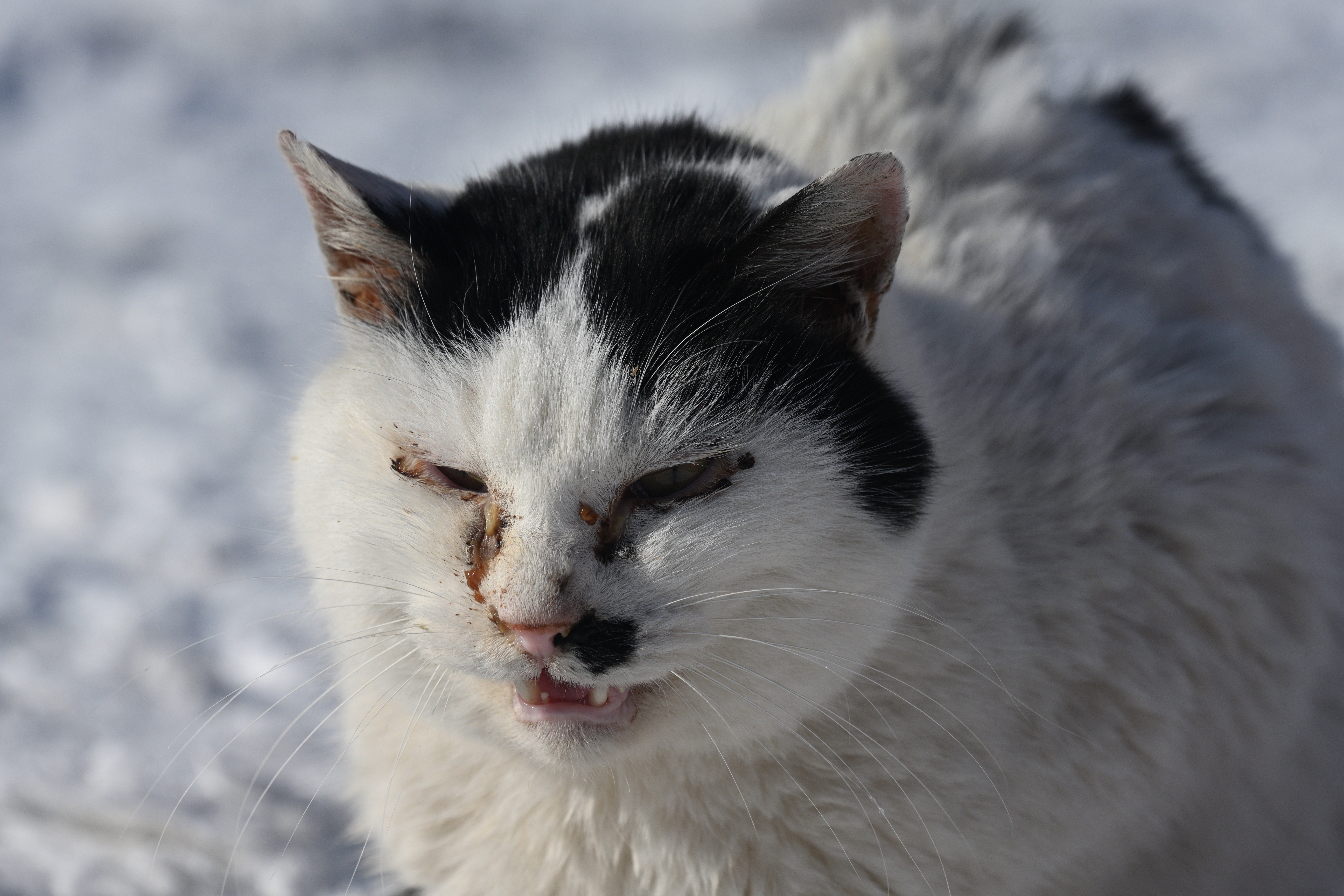 白地に黒の模様で顔は目やにが凍ったのか、ダニに吸われたのか、できものだらけで見るも哀れな顔になっている。