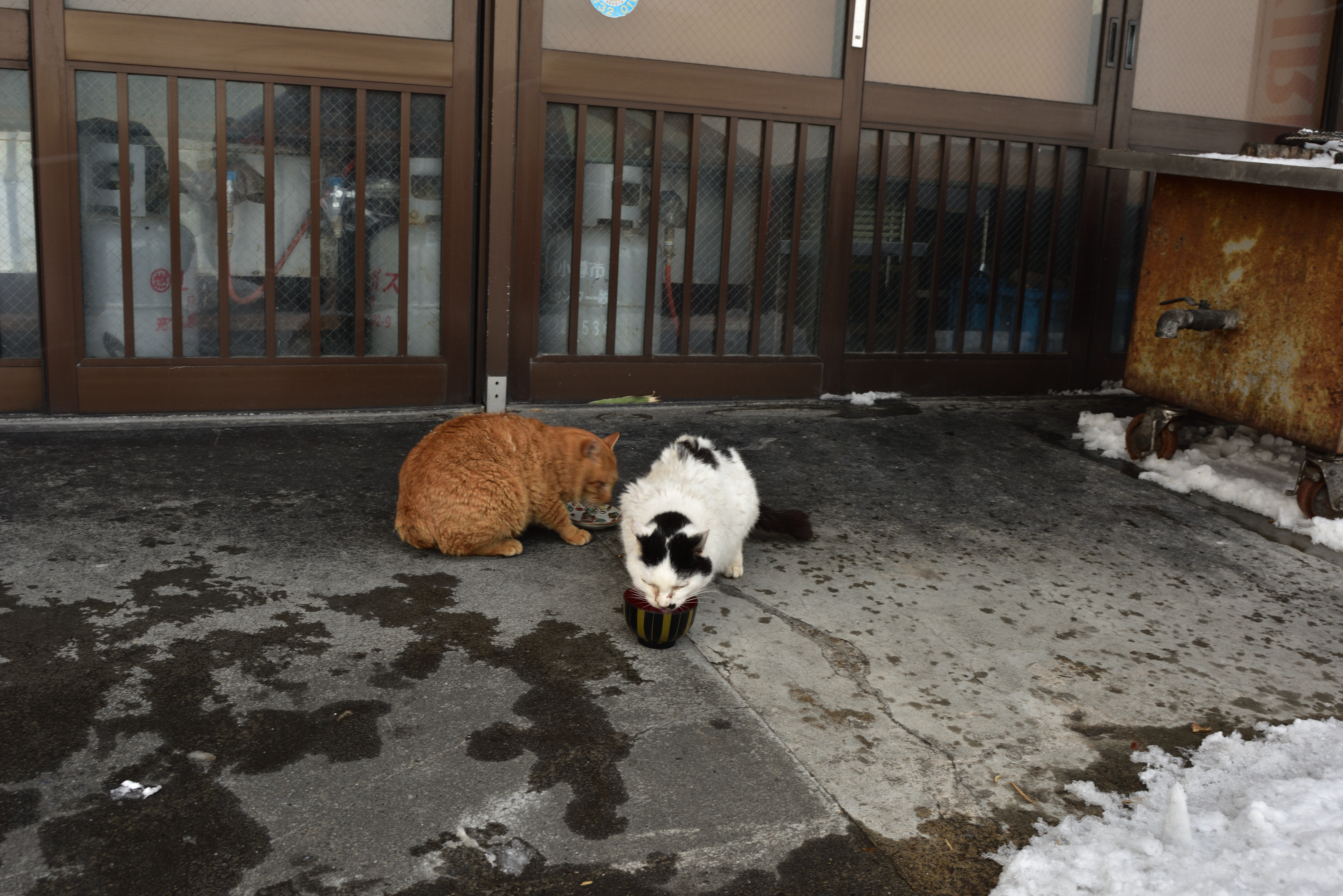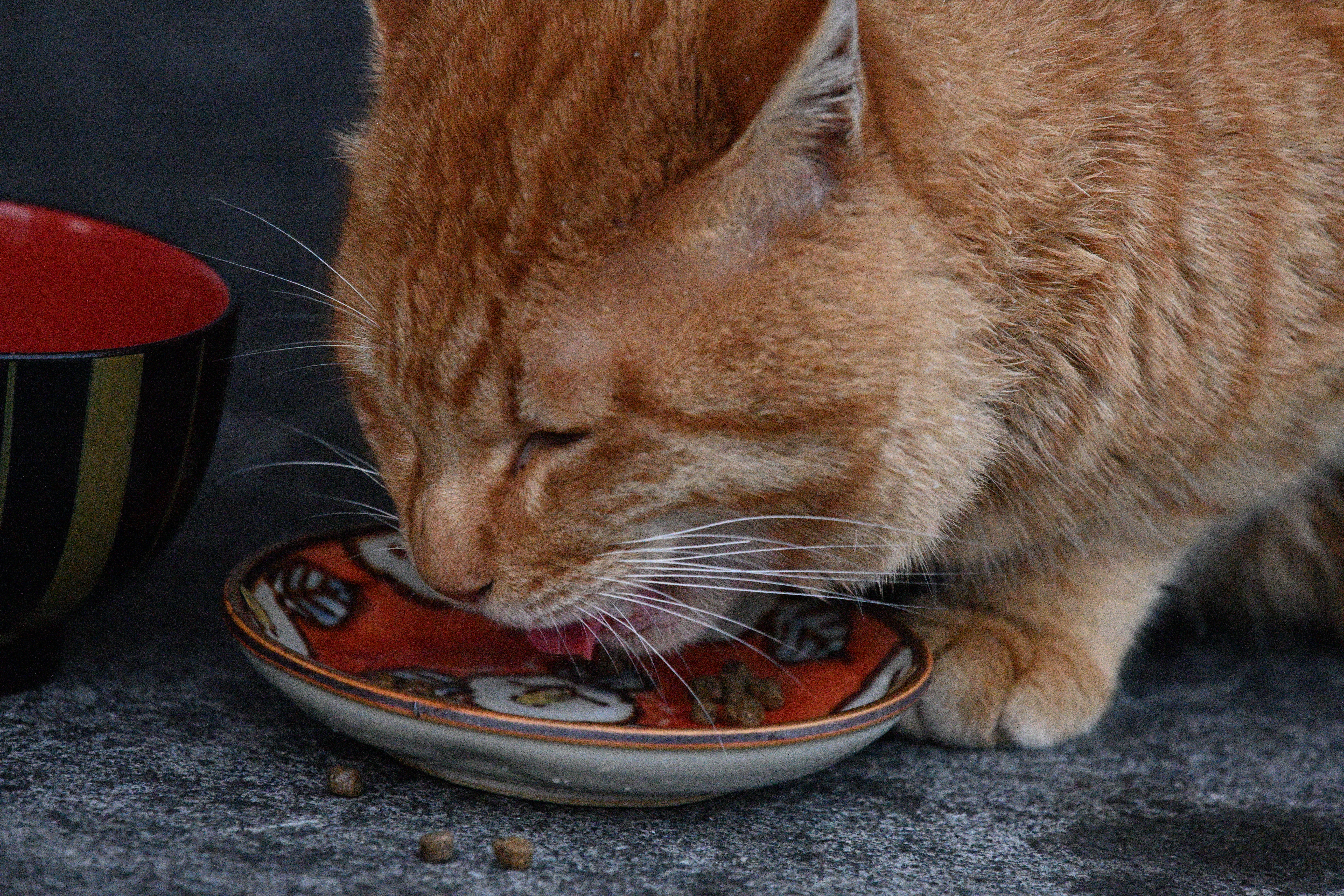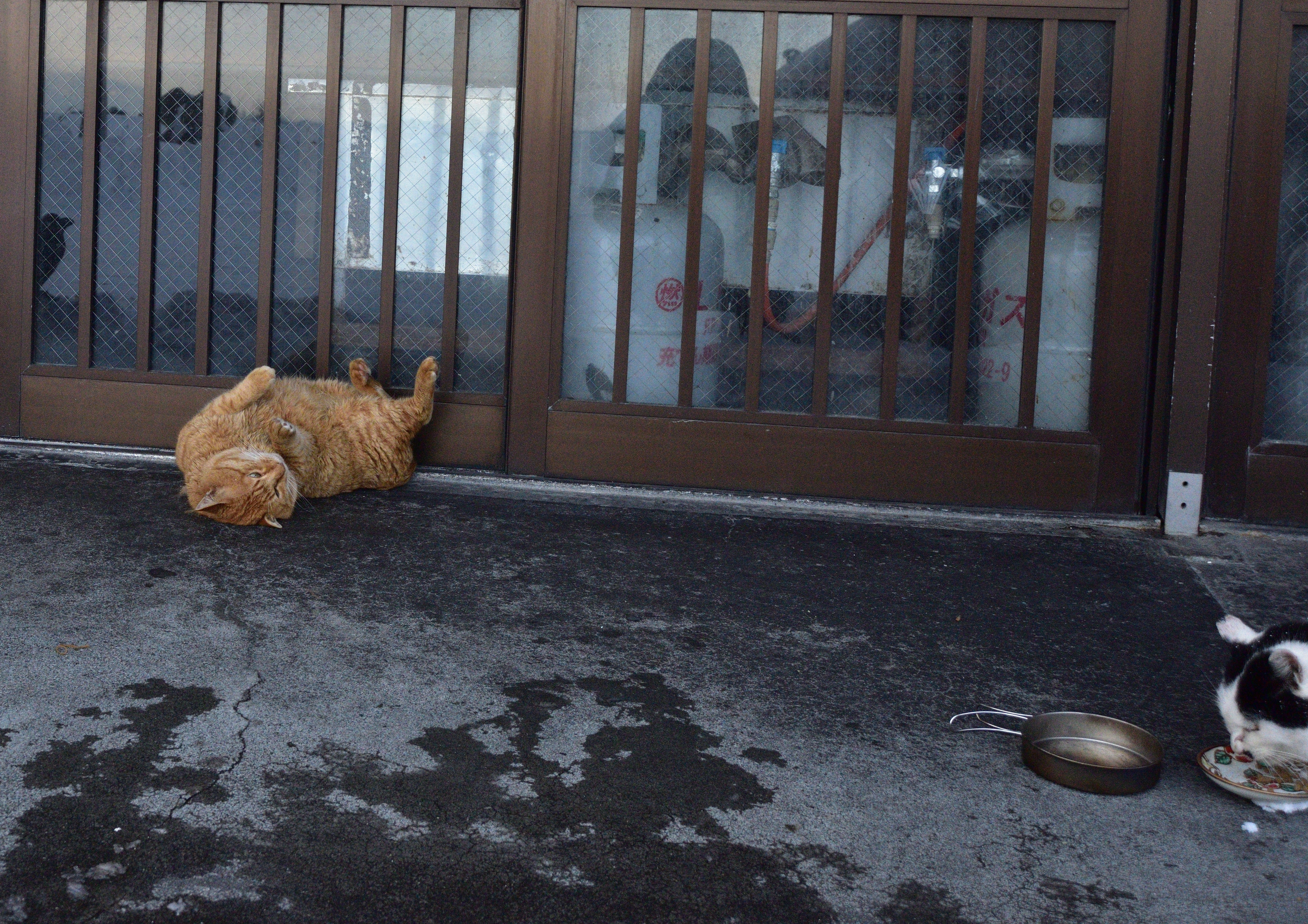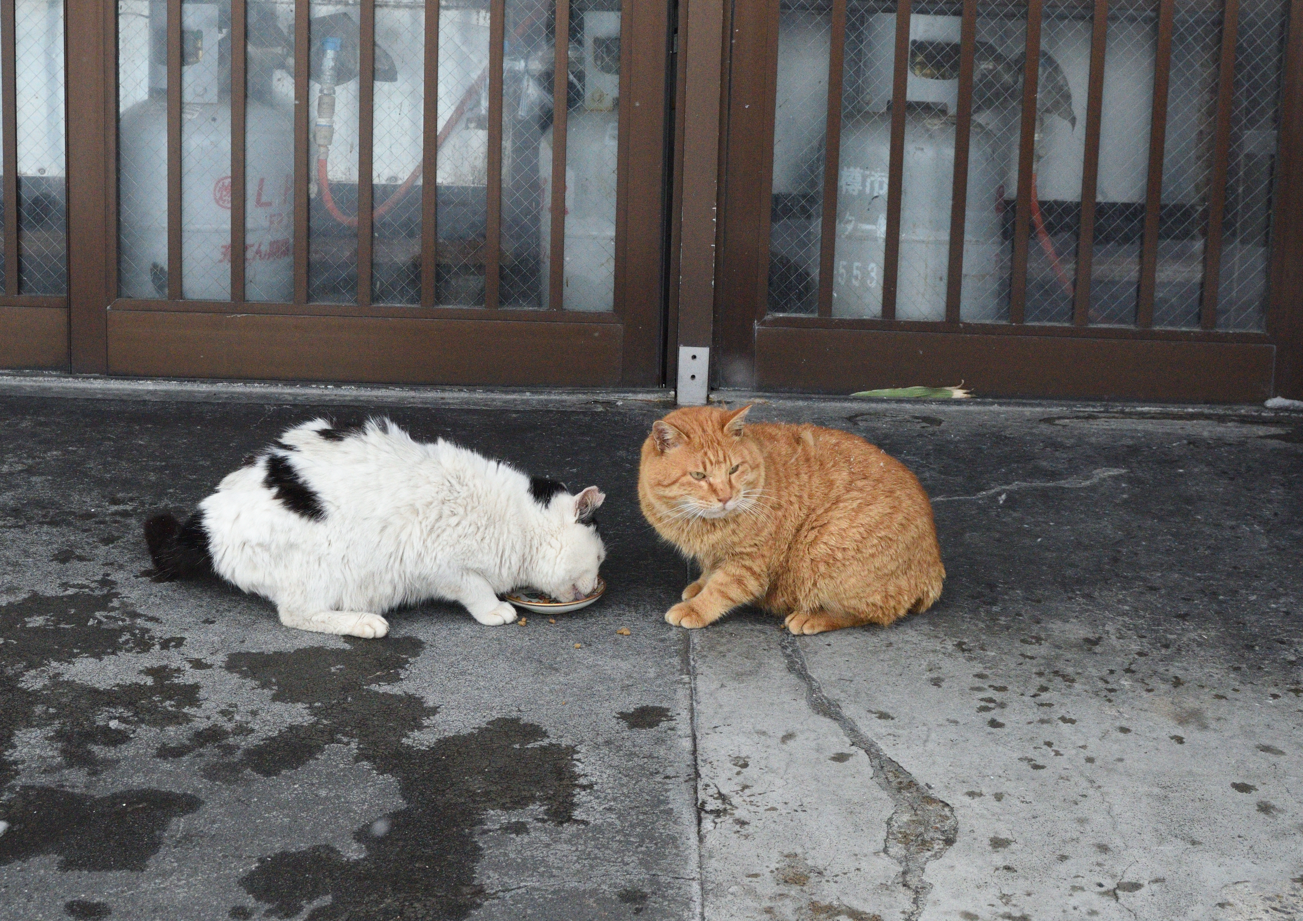 戻ると、白黒猫は近くの食堂の前にいたが、もう一匹の灰白色のキジ白はいない。しかし、茶トラ猫がやってきて持参した食器にフードを入れてあげた。僕を警戒しつつも黙々と食べ始めた。