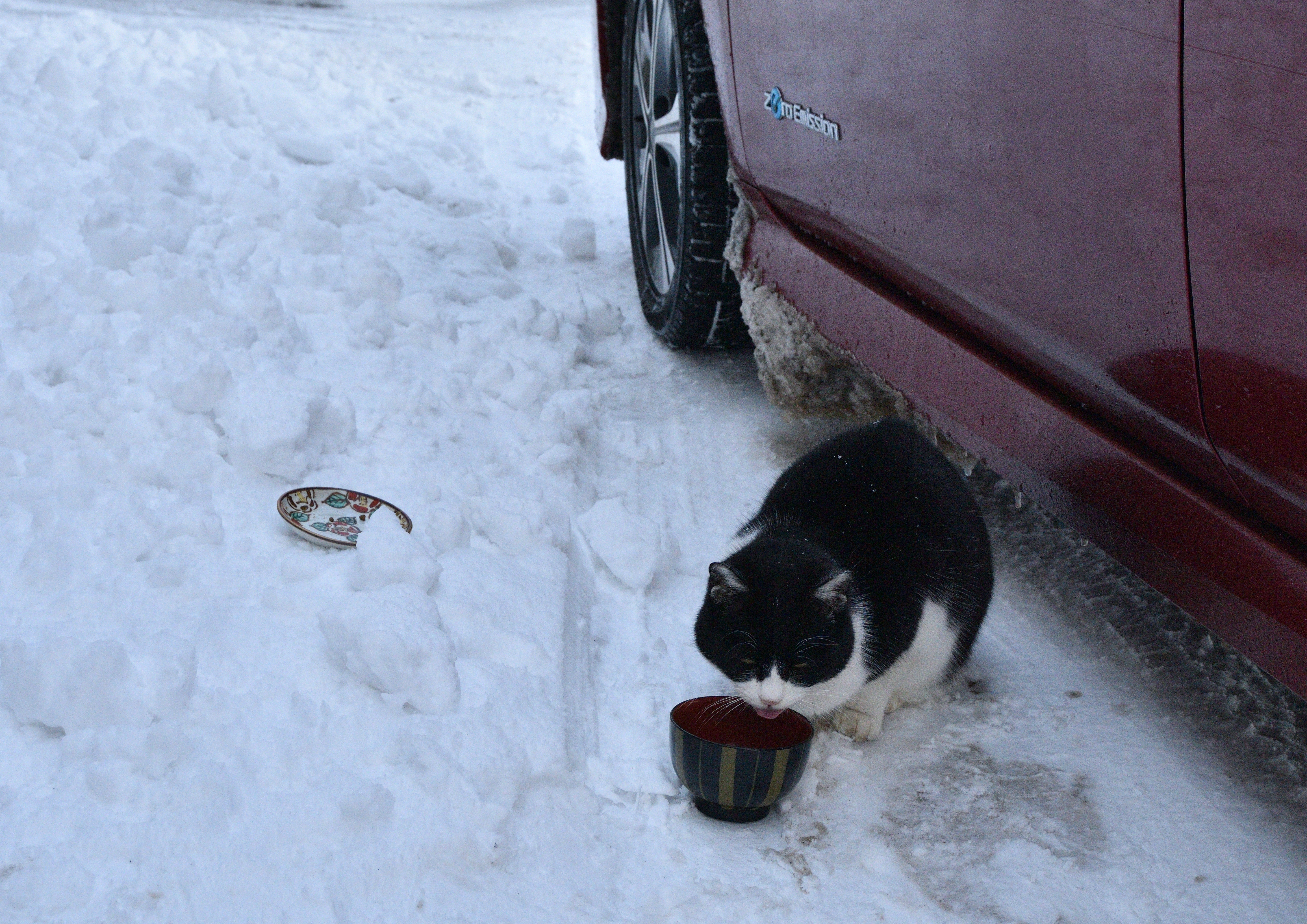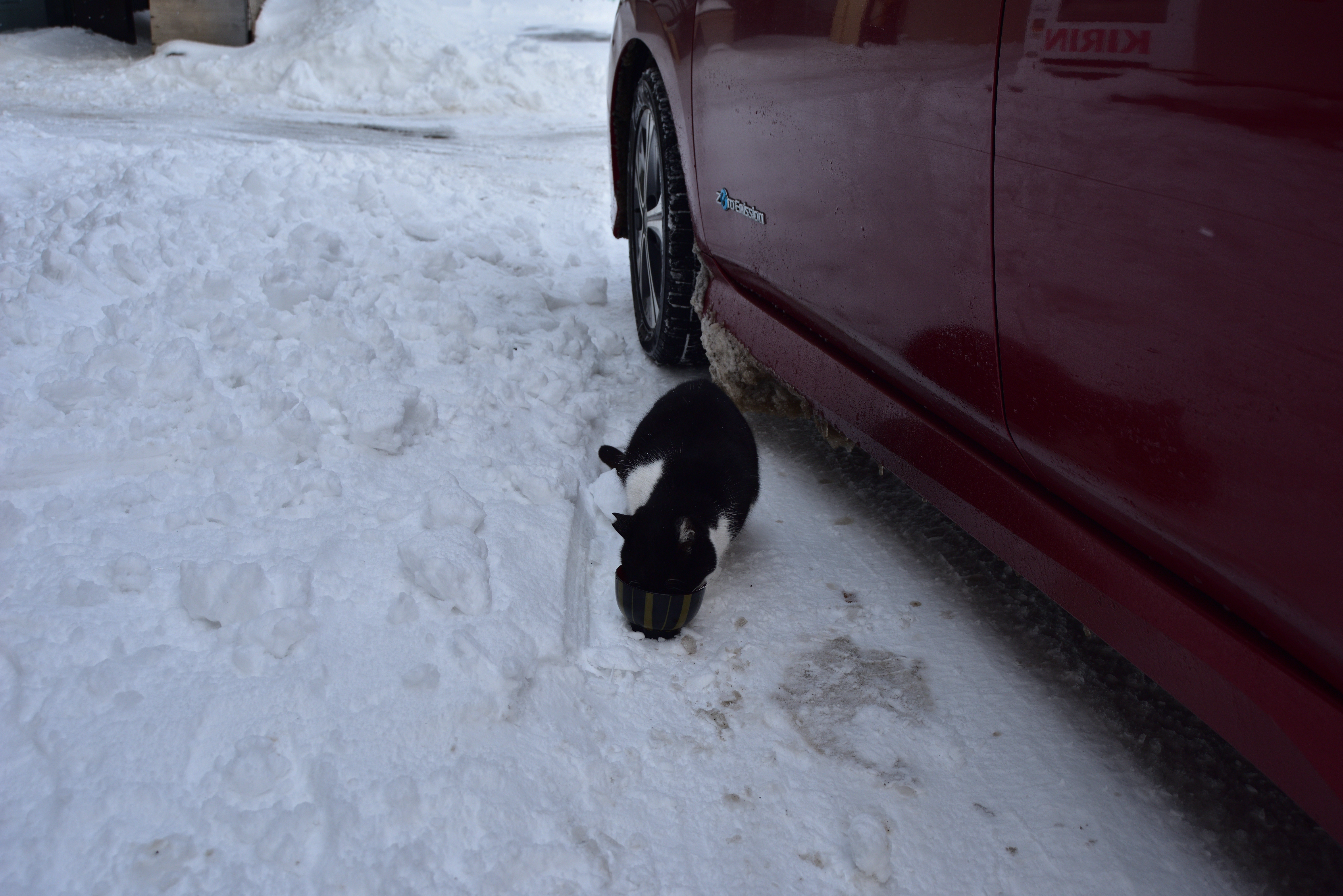 LEAFのそばには相変わらず白黒の野良猫が待っている。