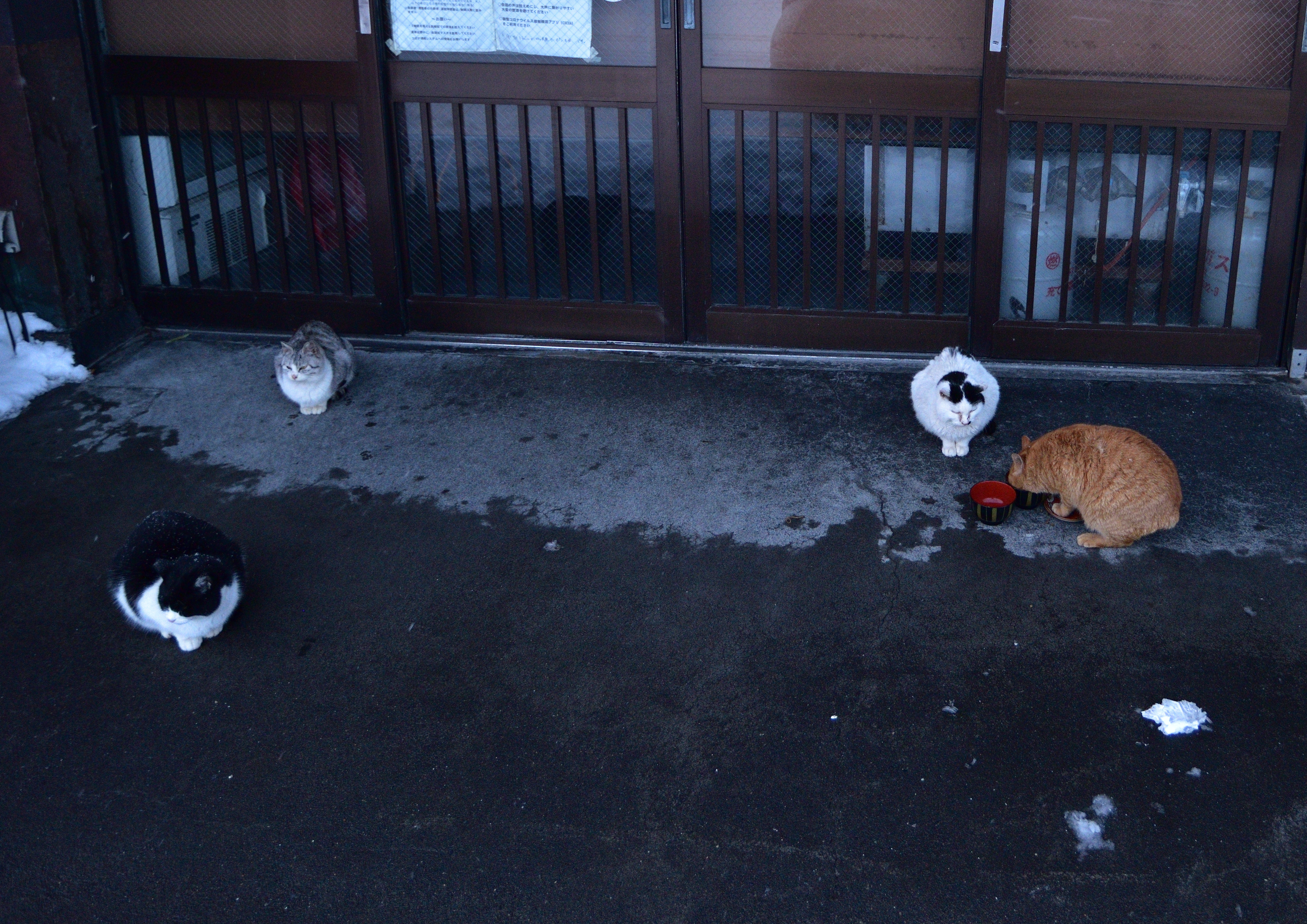 さらに黒地に白の猫が加わった。他の猫に対して極度に遠慮しており、先の2匹が食べ終わるまで、餌をあげても食べようとしないので、先の2匹とは離れたところで食器を出すとやっと食べ始めた。