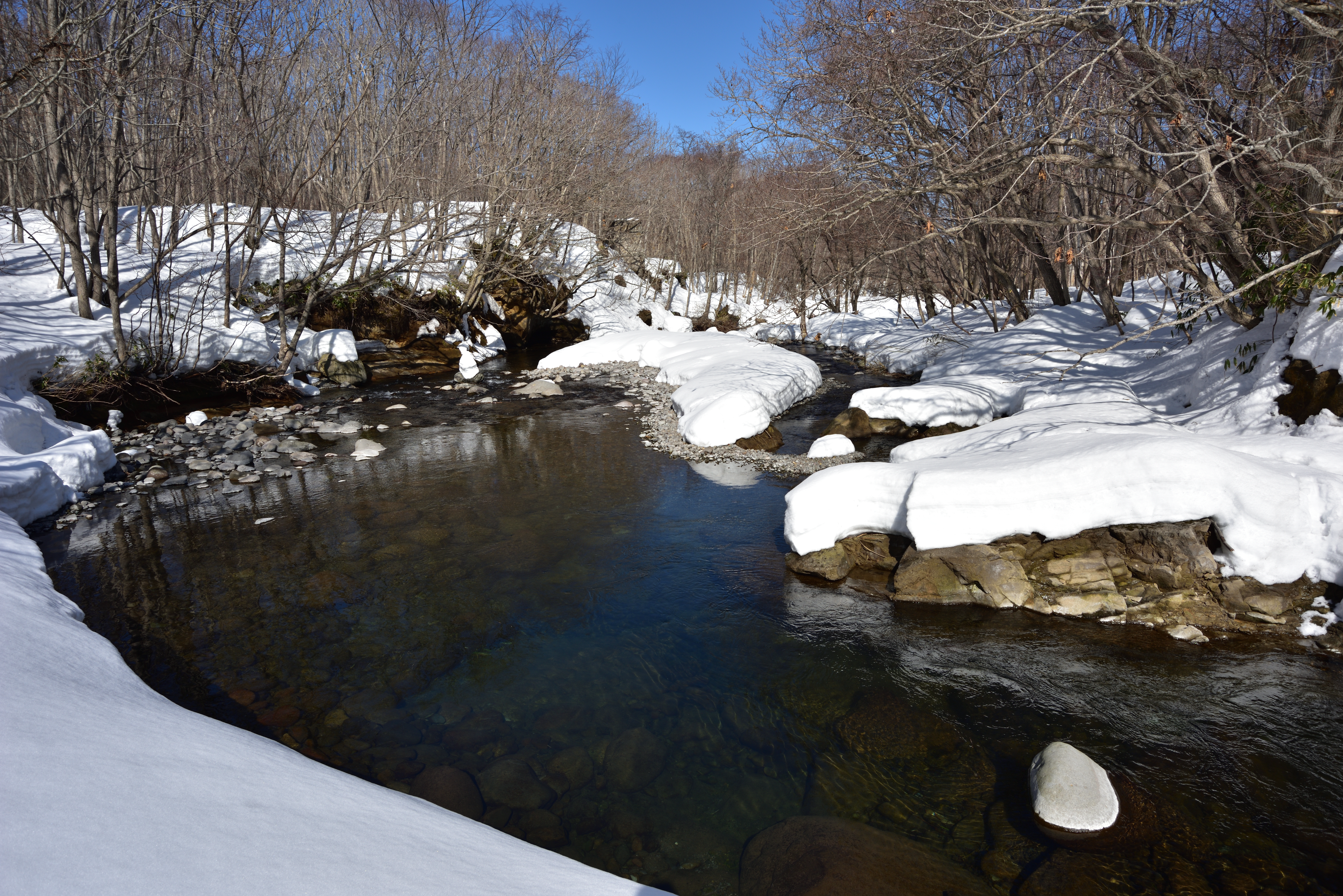 いきなり近くでクマゲラが鳴いている。テレマークスキーを履いて上流を目指した。あたりはまだ一面雪で覆われているが陽射しが降り注ぎ春が近いことを感じさせた。雪面には鹿の足跡が縦横無尽についている。