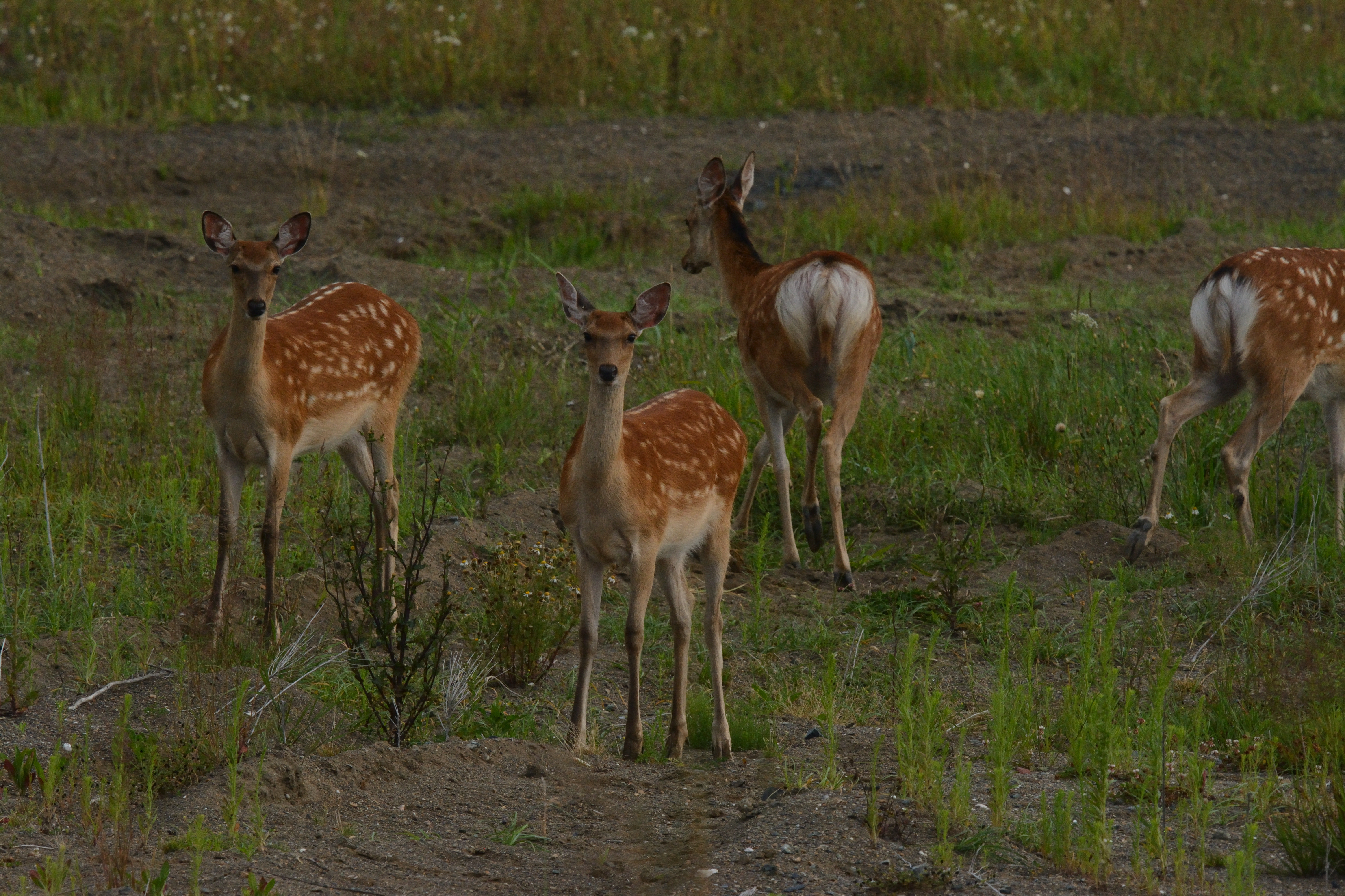 起床後、早々にクッチャロ湖キャンプ場を立ち退き、昨日行ったベニヤ原生花園に向かった。途中、人の手が入った後の荒れた草地で、数頭のエゾシカの群れに遭遇した。