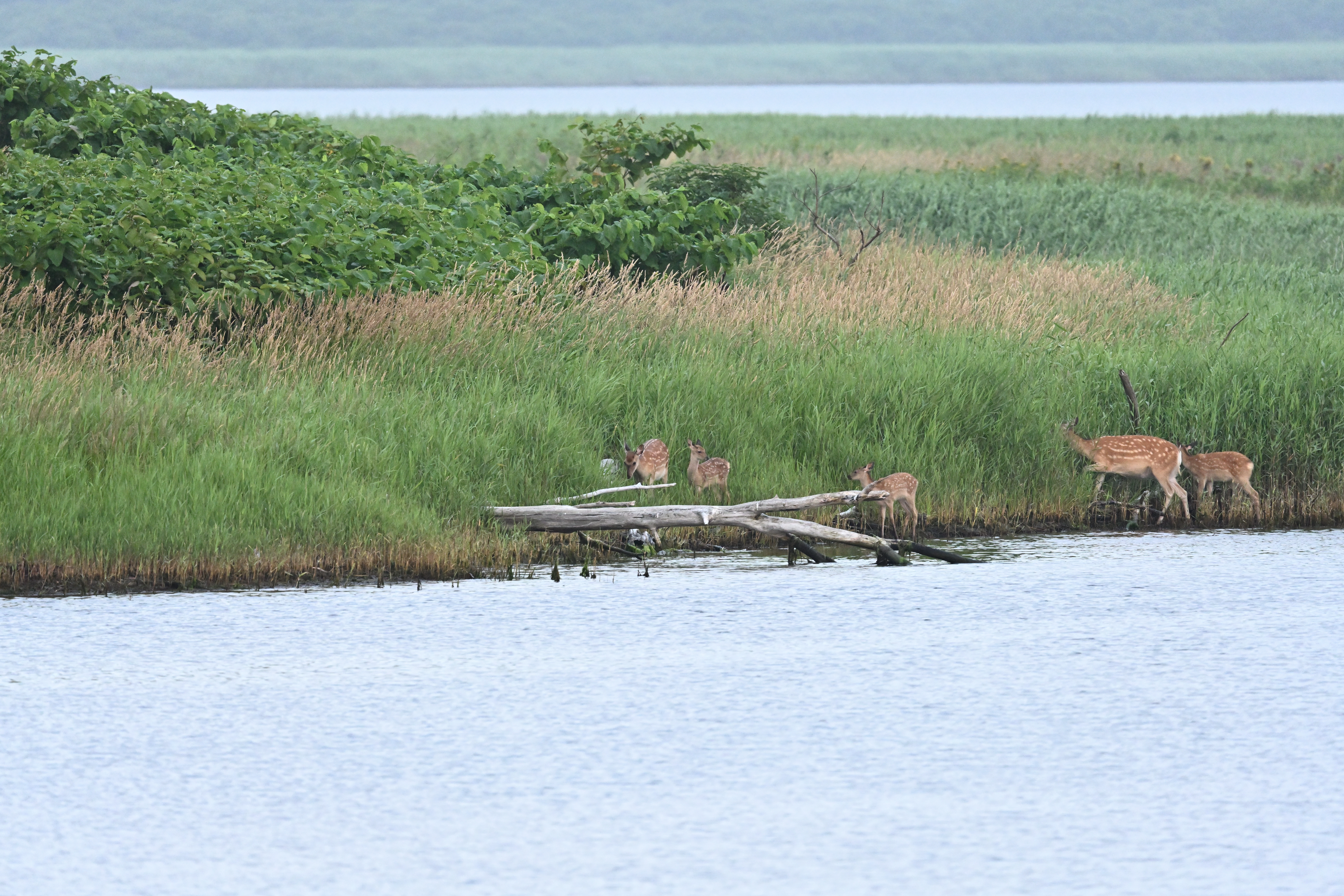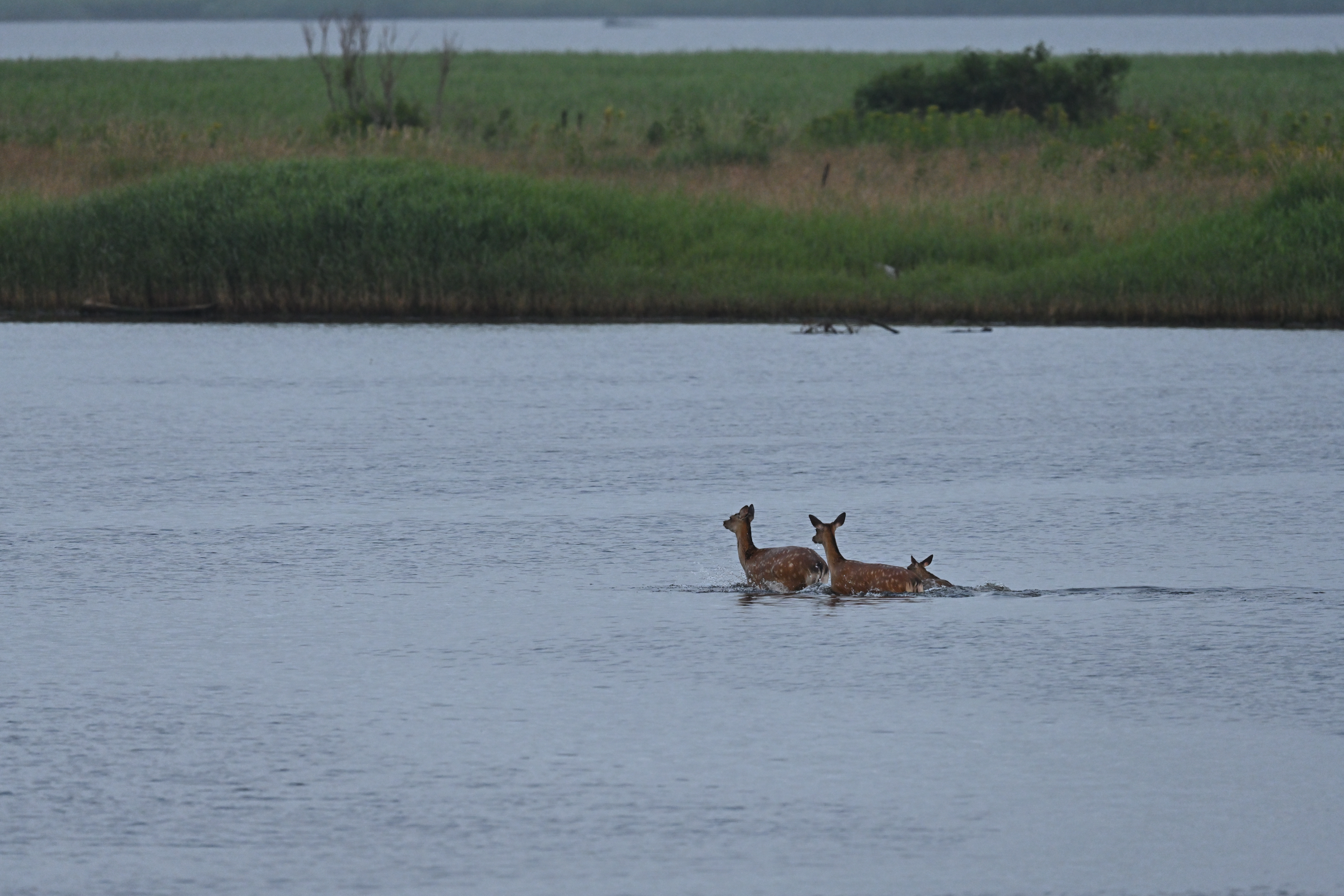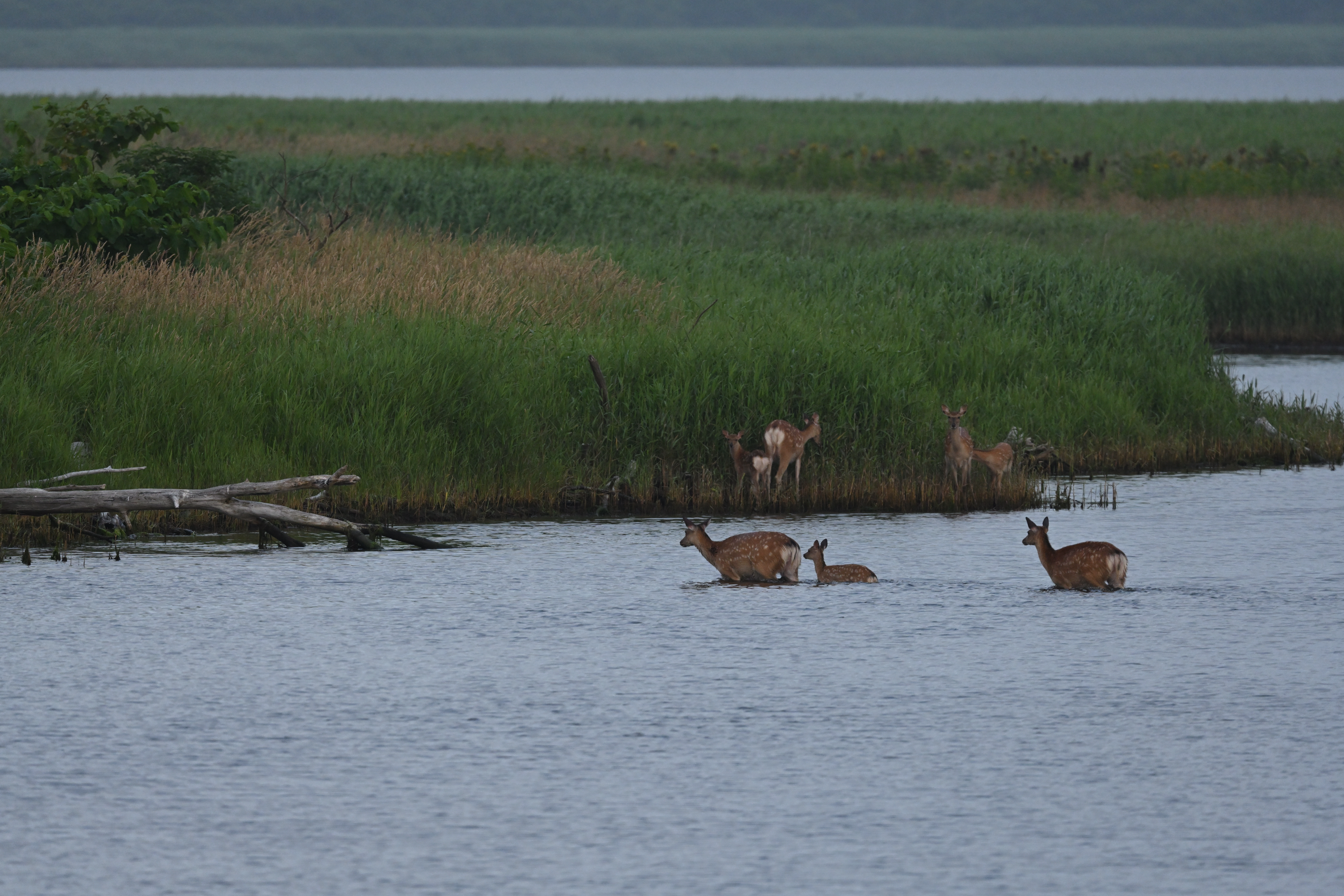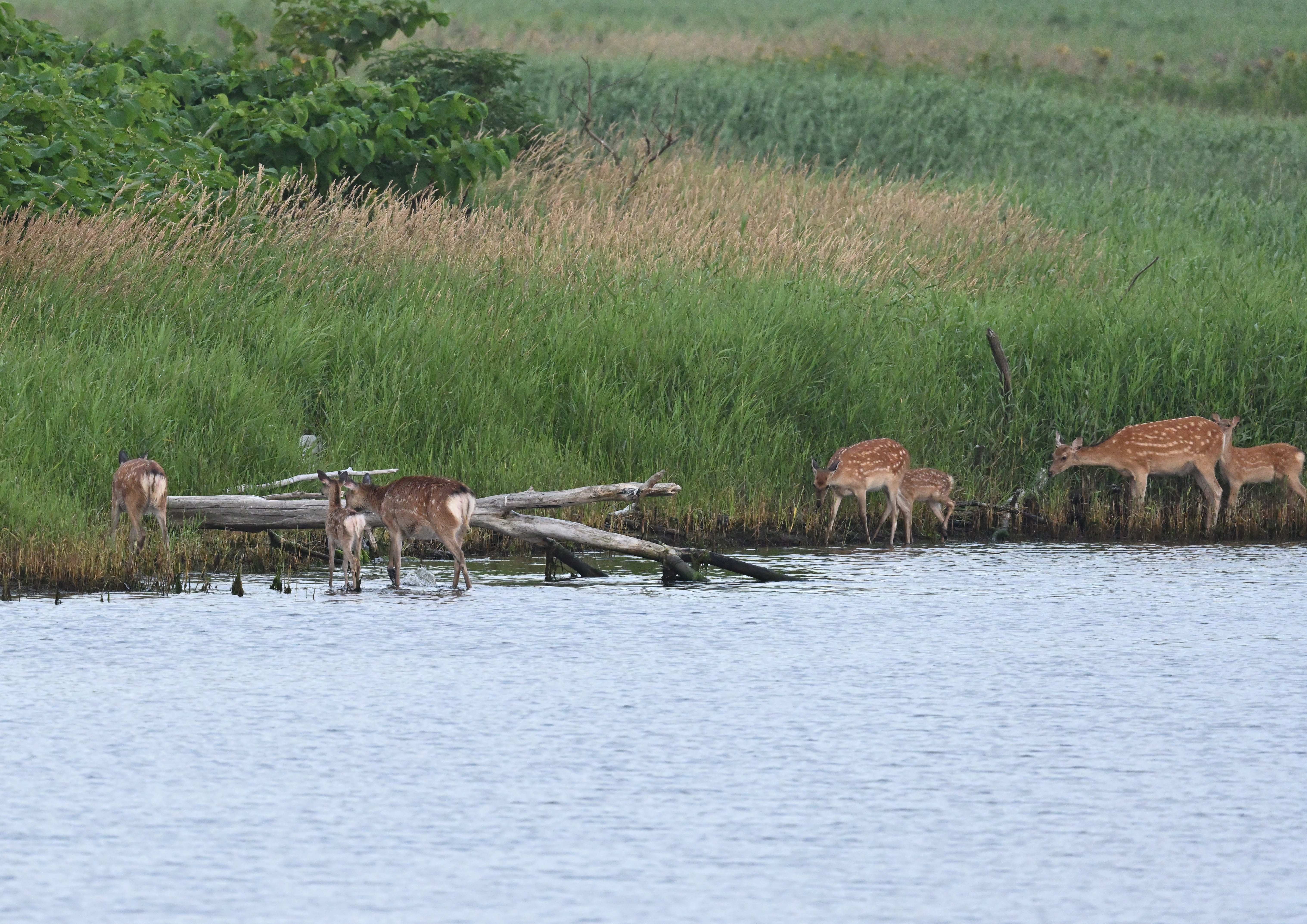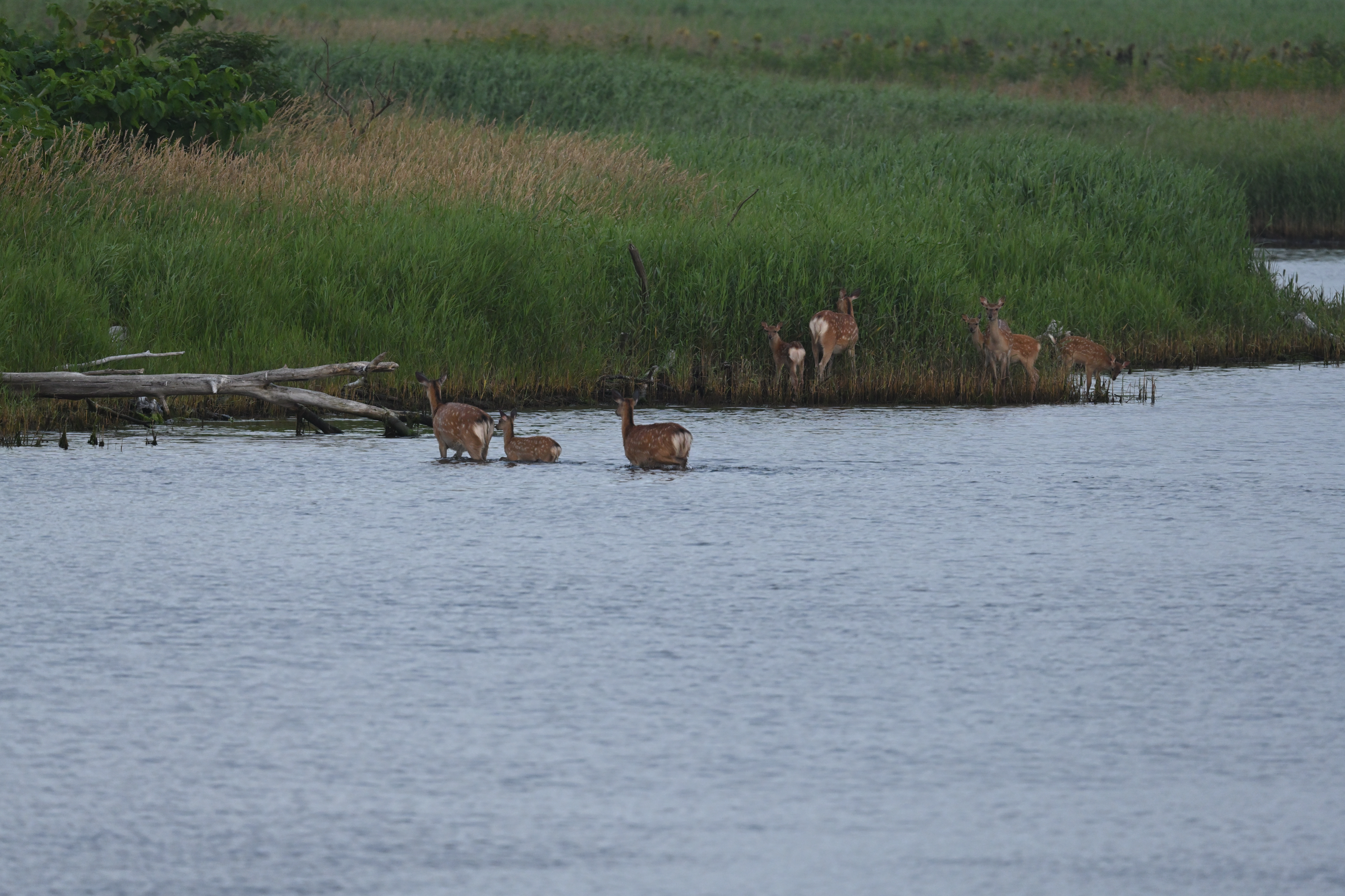 鹿の親子は川辺で草の根でも食べているのだろうか。護岸工事されている川ではこうした採食もできなくなるので、貴重な環境だ。