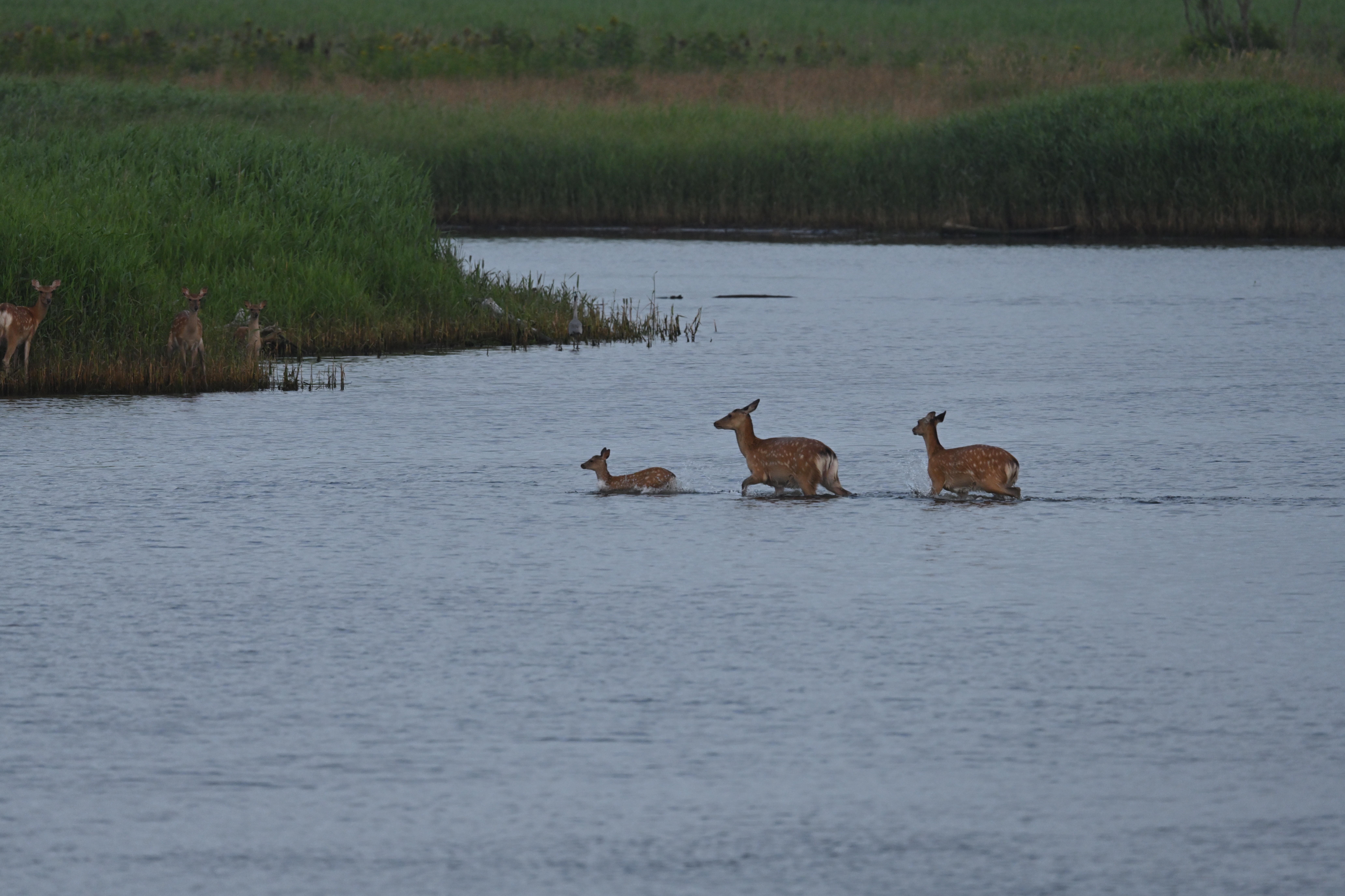 この日の札幌の日の出時刻は4時29分だった。5時頃に着くと、一息つく暇もなく、エゾシカの群れが川を渡っている光景を目にした。すぐに移動して正解だった。