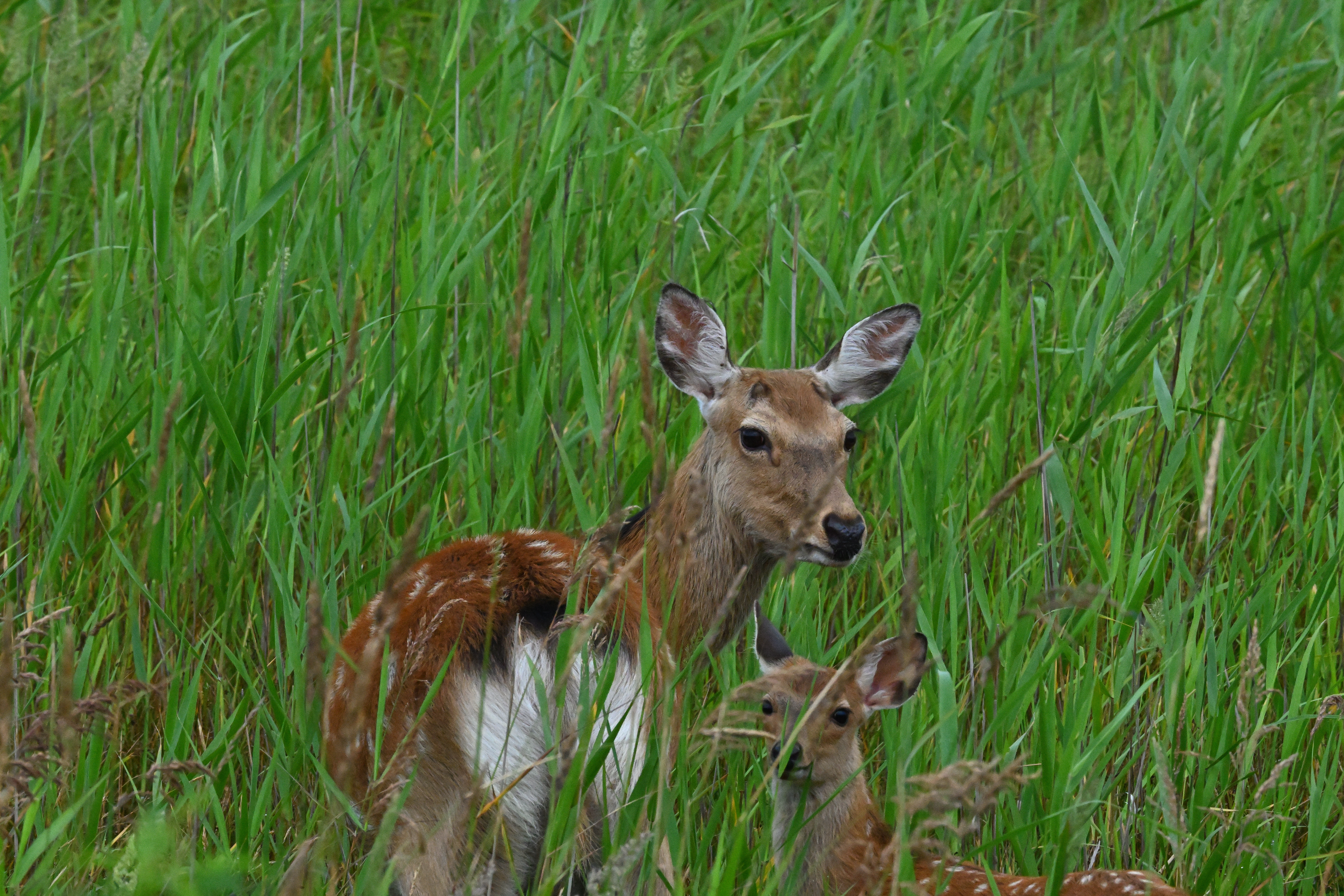 カメラを構えている私の近くの草原に、鹿の親子がやって来た。