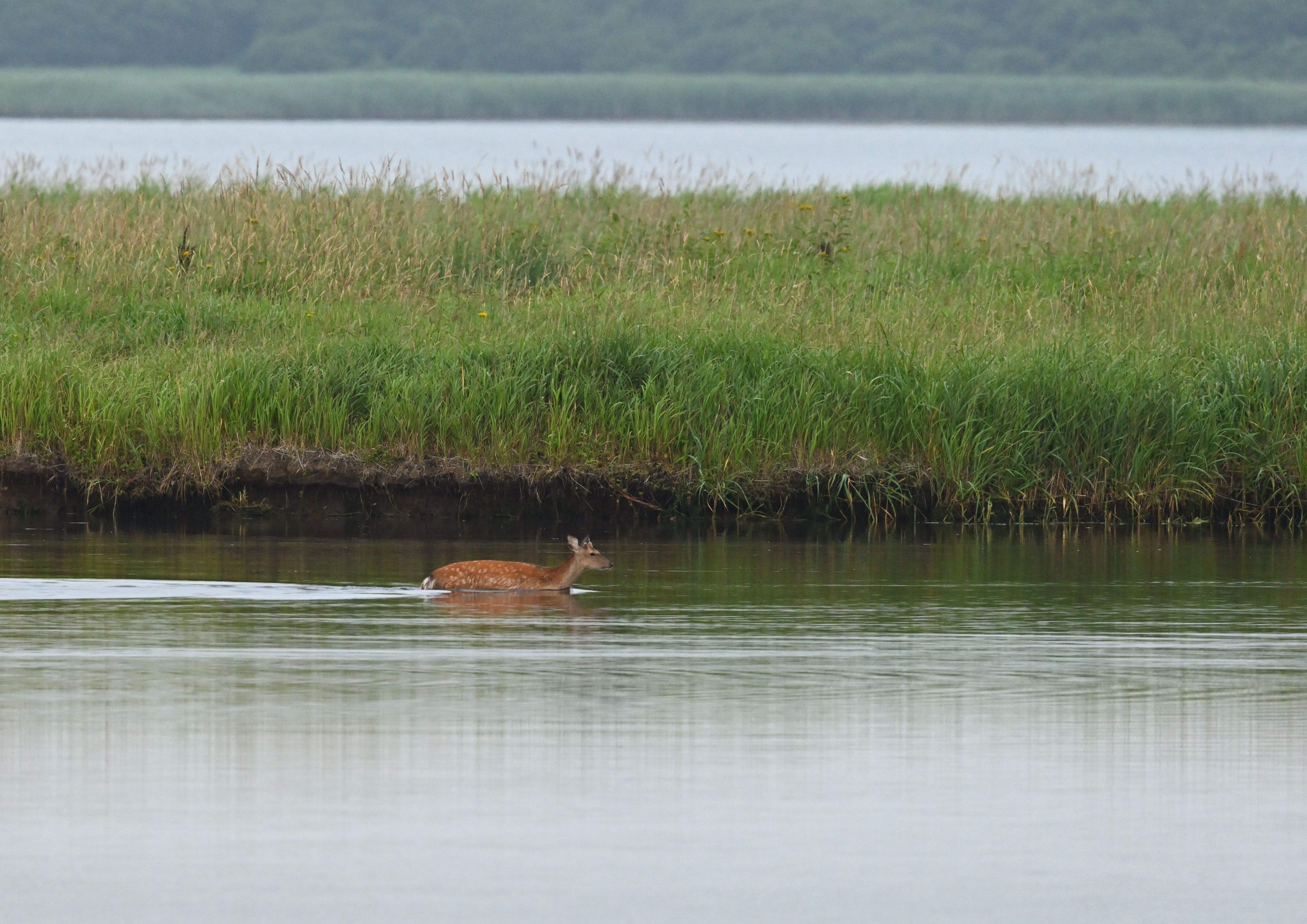 再び川に目を向けると、1頭のエゾシカがこれまでとは反対の方向に川を渡っている。