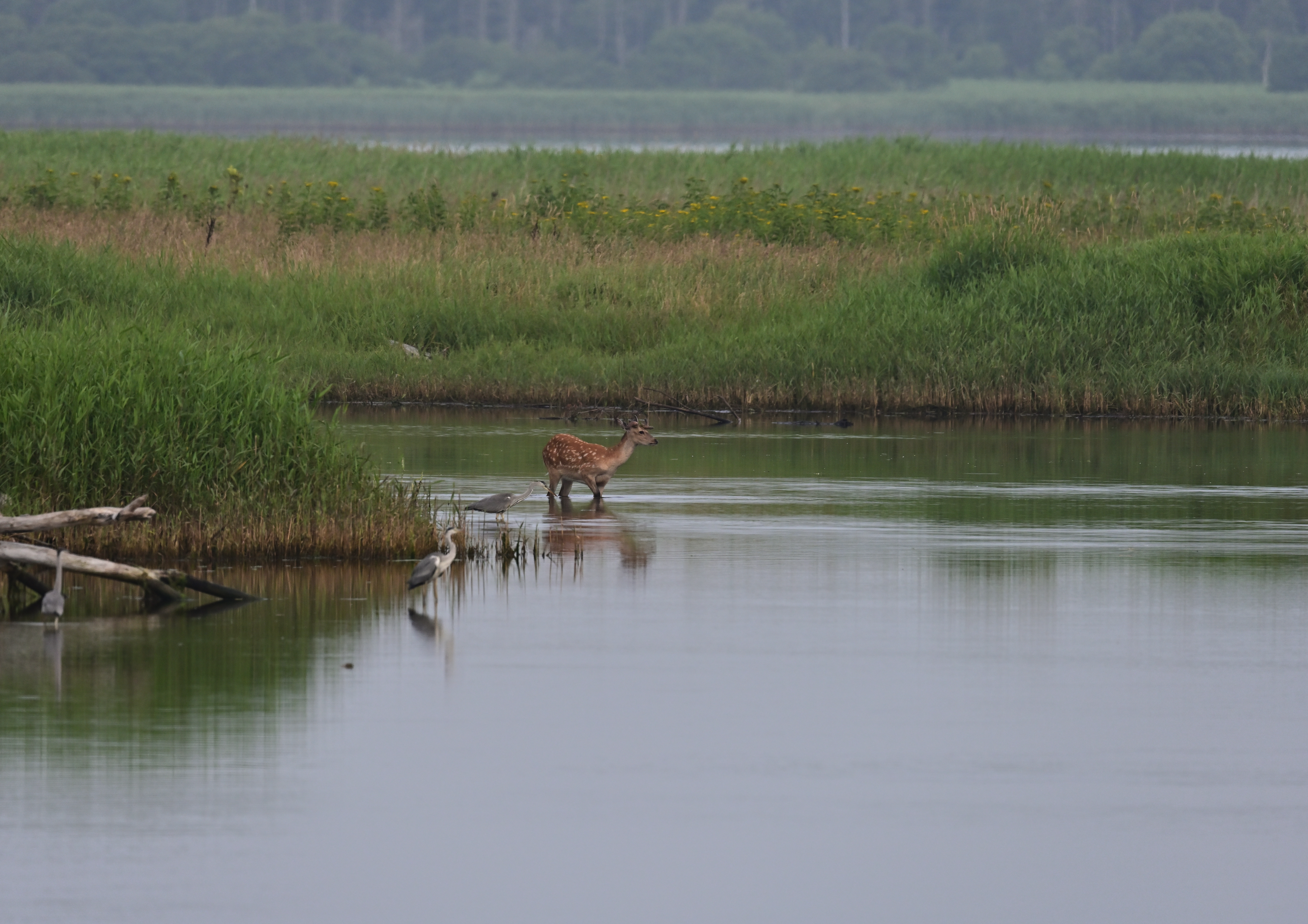 再び別の鹿が川を渡ろうとしている。手前にはアオサギが獲物を狙っているようだ。