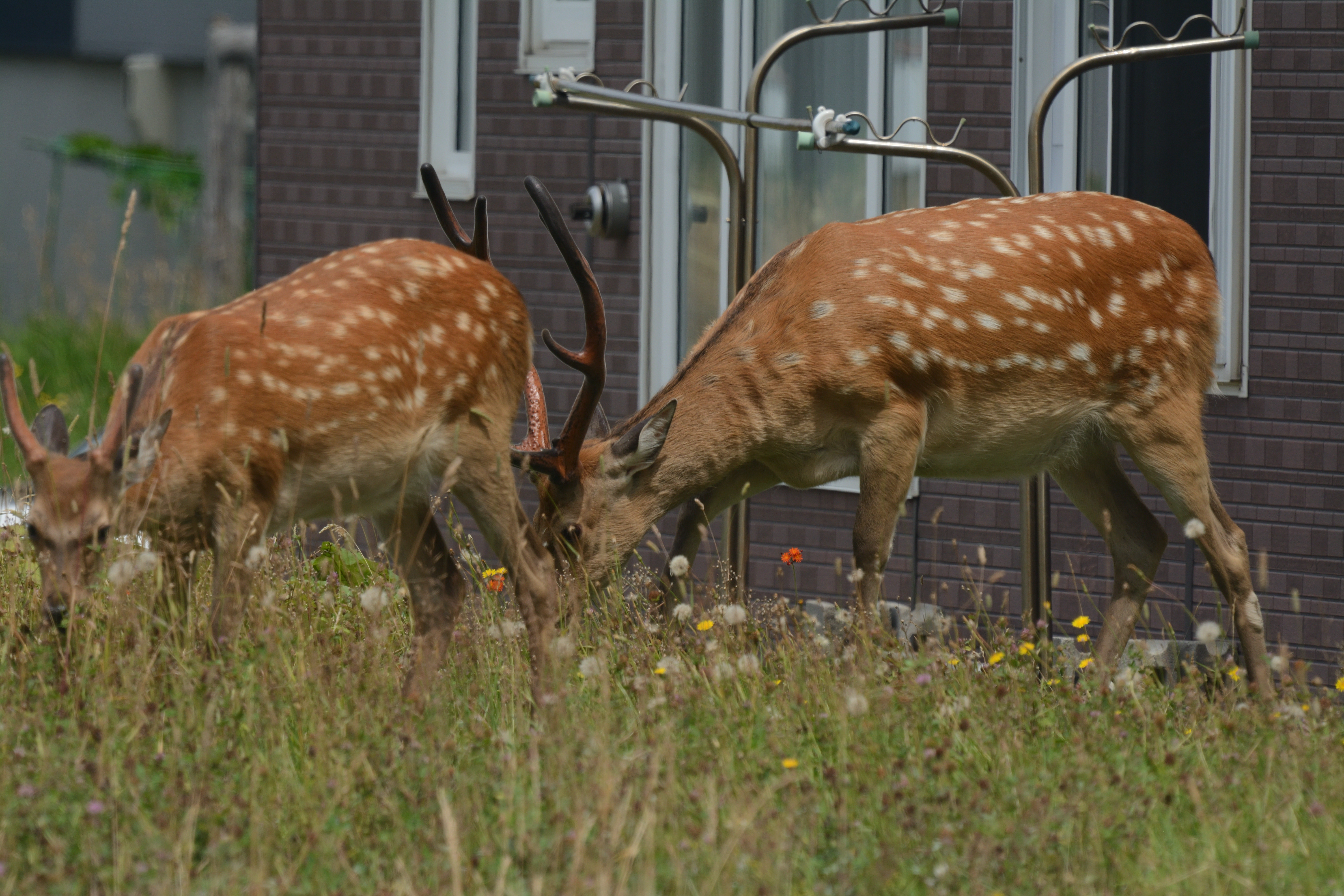 横断歩道を渡った先の住宅前で草を食む鹿の群れ