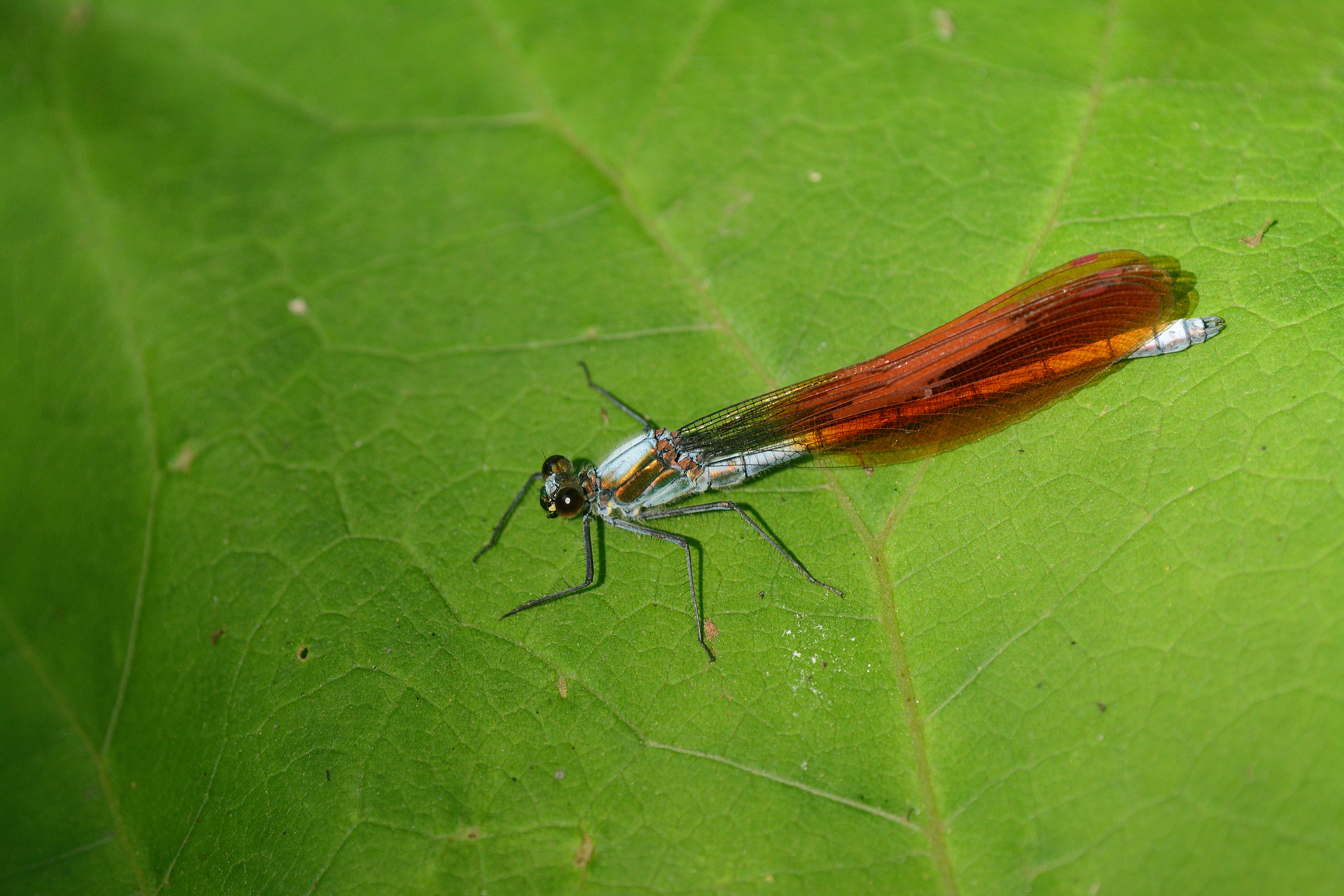 もと来たイトトンボのいた当たりの小川に戻ると、羽が透き通った琥珀色で体が水色の、普段見かけないトンボがいた。帰宅後調べると、オオカワトンボどった。
